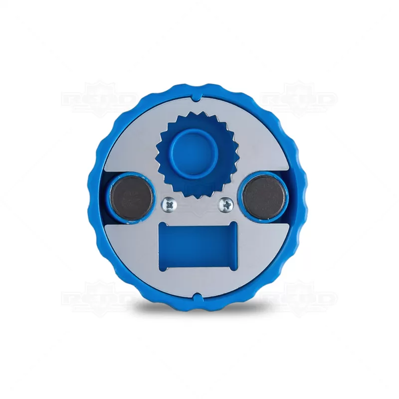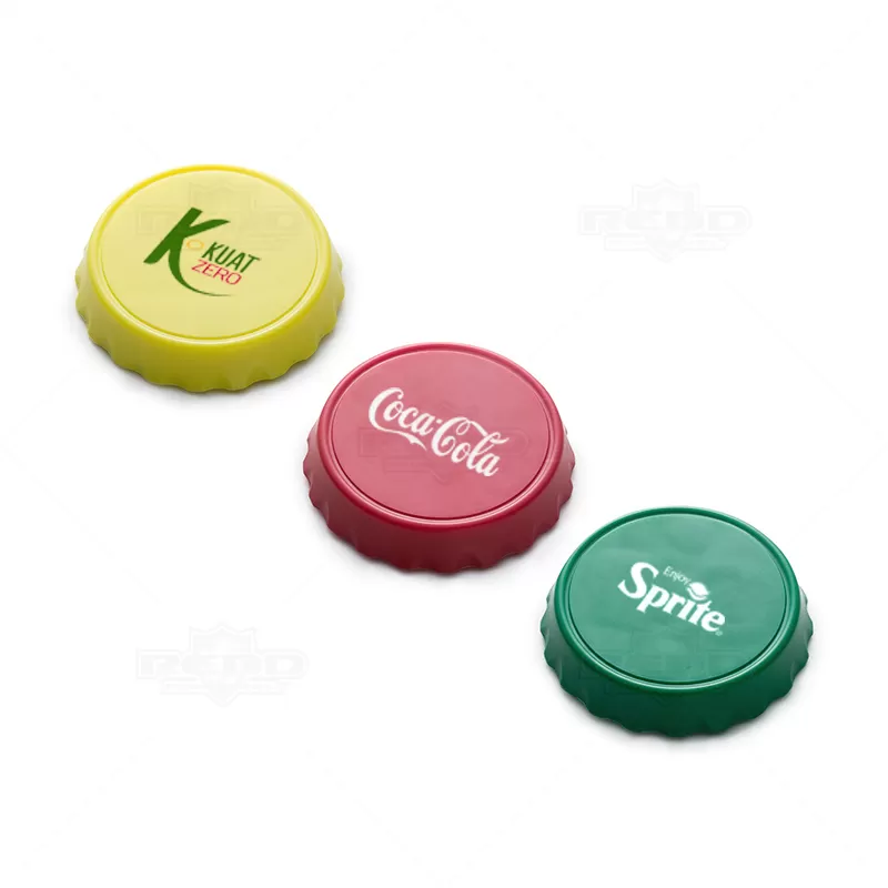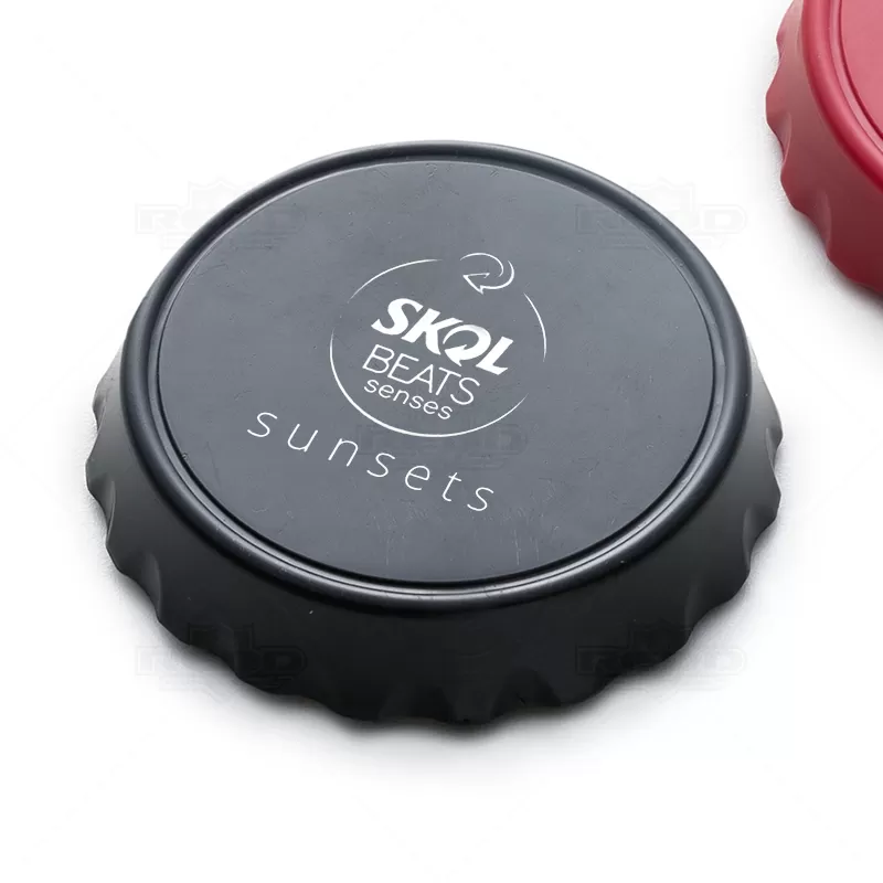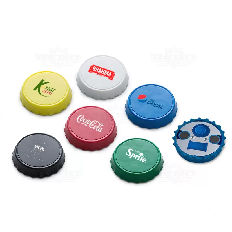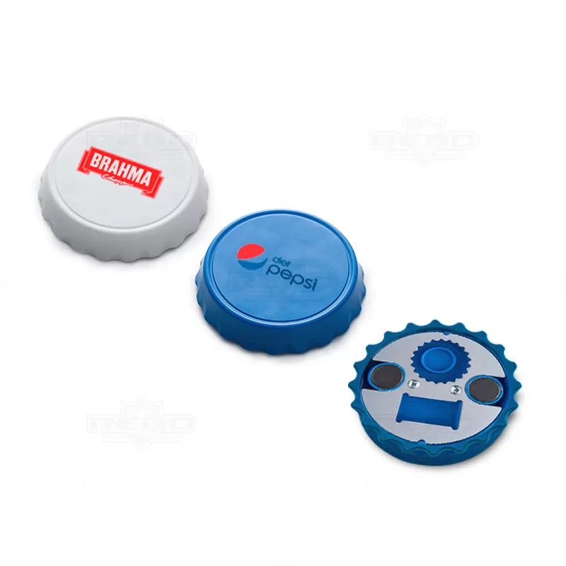 Abridor de garrafa personalizado produzido em plástico com acabamento em inox na parte inferior. Possui 1 compartimento para abertura de tampa de garrafas em metal e outro para tampa de garrafa Pet rosqueáveis. Sua base contém imãs para fixação em objetos metálicos, ou em geladeiras. Ideal para brindes promocionais e eventos corporativos.