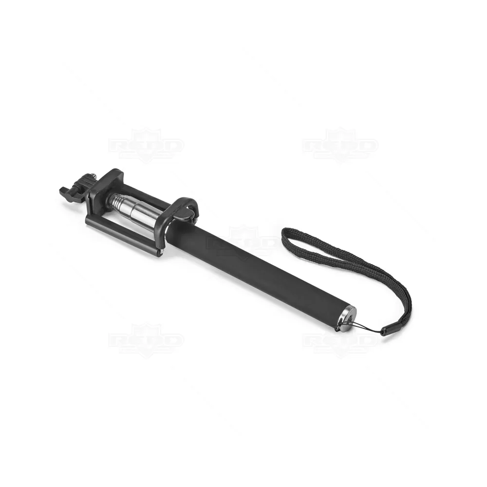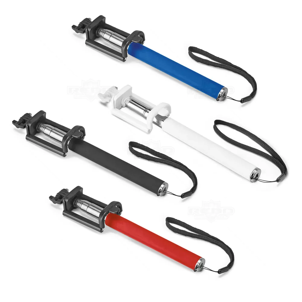 Bastão de selfie personalizado produzido em PVC E aço inox com suporte para celular ajustável, alça de punho em nylon e bastão extensível de 1040mm. Ideal para brindes promocionais e eventos corporativos. Imagem ilustrativa