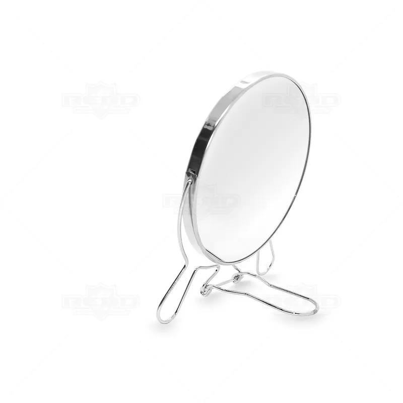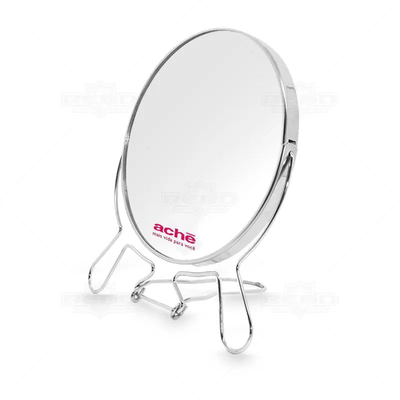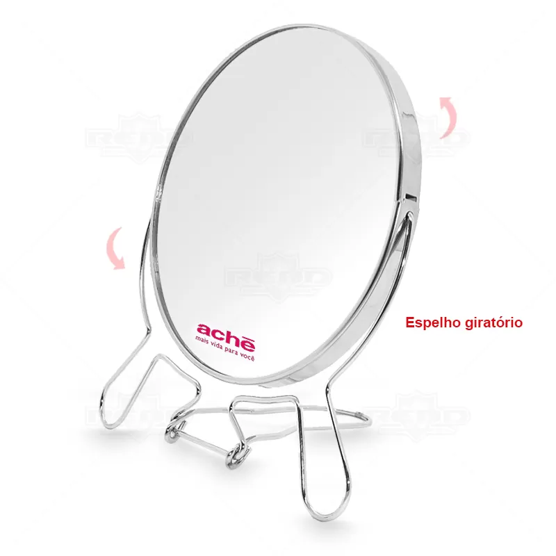 Espelho giratório personalizado com armação de metal retrátil, base resistente, lente de aumento e eixo central giratório. Diâmetro do espelho: Ø137mm. Ideal para brindes promocionais e eventos corporativos.