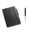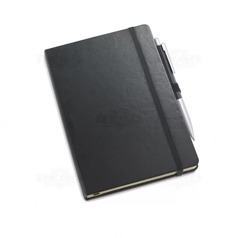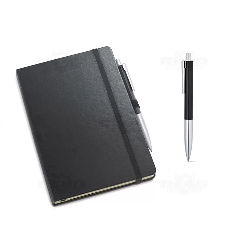 Conjunto escritório personalizado, constituído por 01 caneta de metal, esferográfica na cor preta, acionamento da escrita por click e 01 bloco para anotações com capa dura e aproximadamente 96 folhas não pautadas na cor marfim. Possui embalagem em cartonagem e revestimento interno almofadado. Ideal para divulgar sua empresa em eventos corporativos, brindes personalizados e campanhas promocionais. Bloco: 137 x 210 mm / Caneta: ø11 x 136 mm