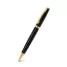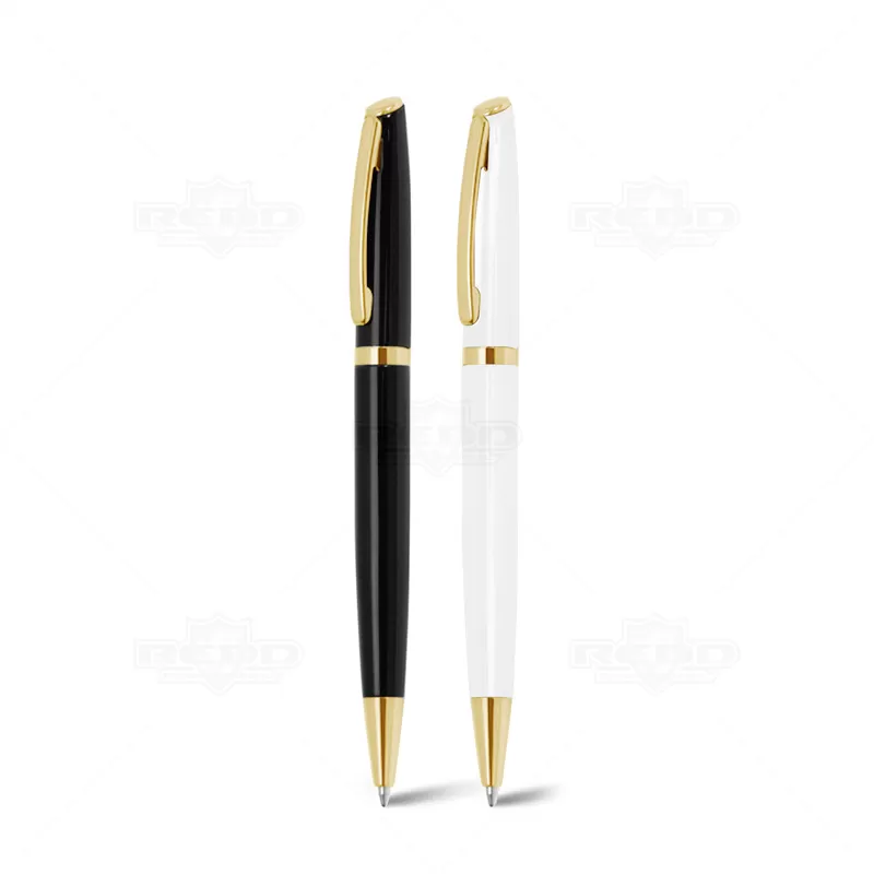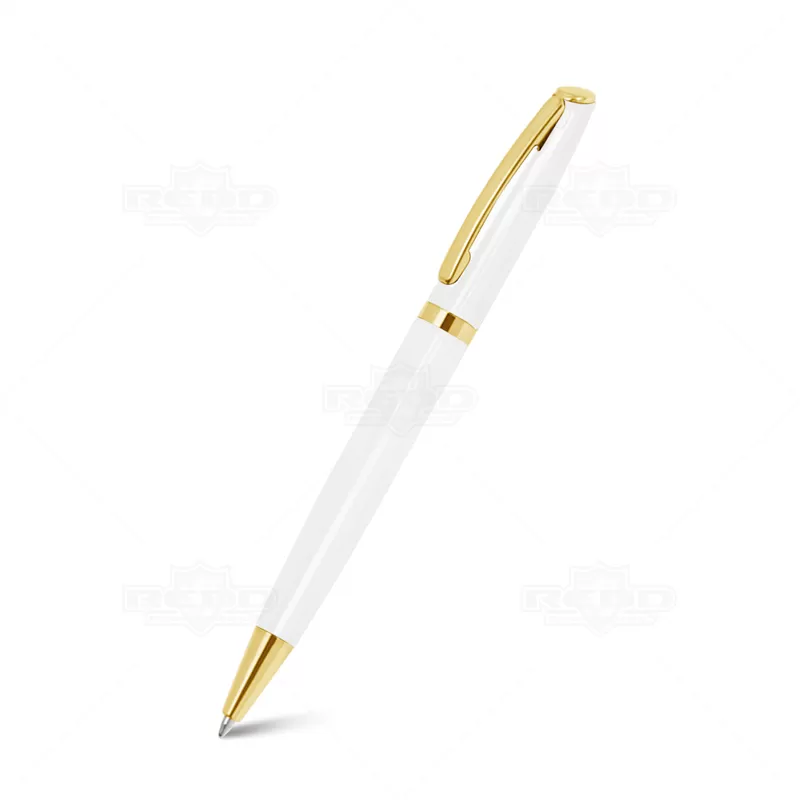 Caneta de metal personalizada com esferográfica na cor azul, possui acionamento da ponteira por giro e detalhe no clip e no corpo da caneta em dourado. Ideal para brindes promocionais e eventos corporativos.