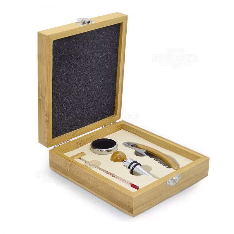Kit Vinho 4 Peças Personalizado produzido em bambu e zinco, acompanha Saca-rolhas com canivete em acabamento diferenciado, termômetro, rolha e wine collar. É o brinde personalizado ideal para sua campanha de marketing e eventos promocionais.