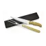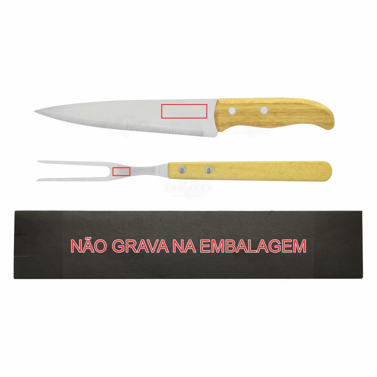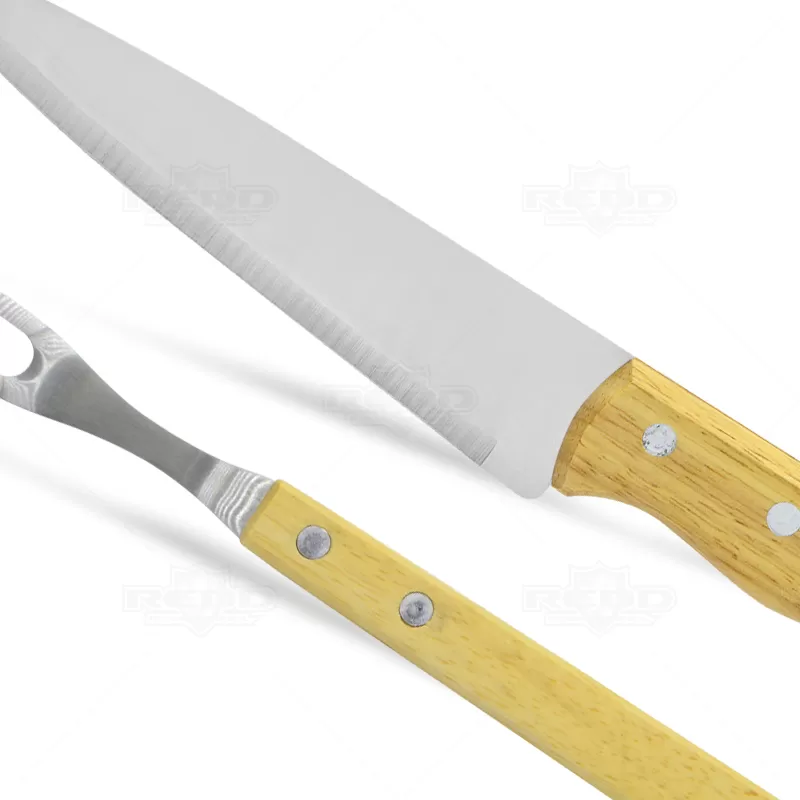 Kit churrasco personalizado com faca e garfo ambos com cabo de madeira. Acompanha estojo em Kraft preto. Ideal para brindes promocionais e eventos corporativos.