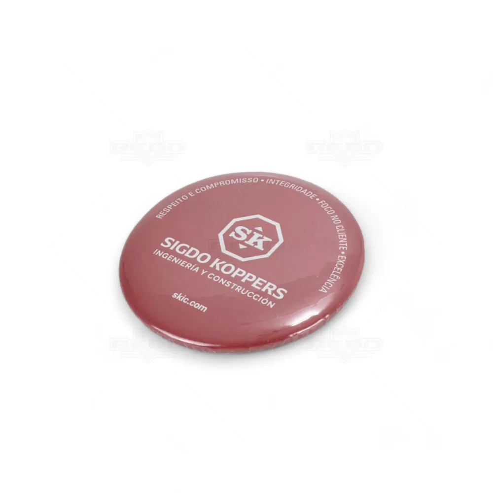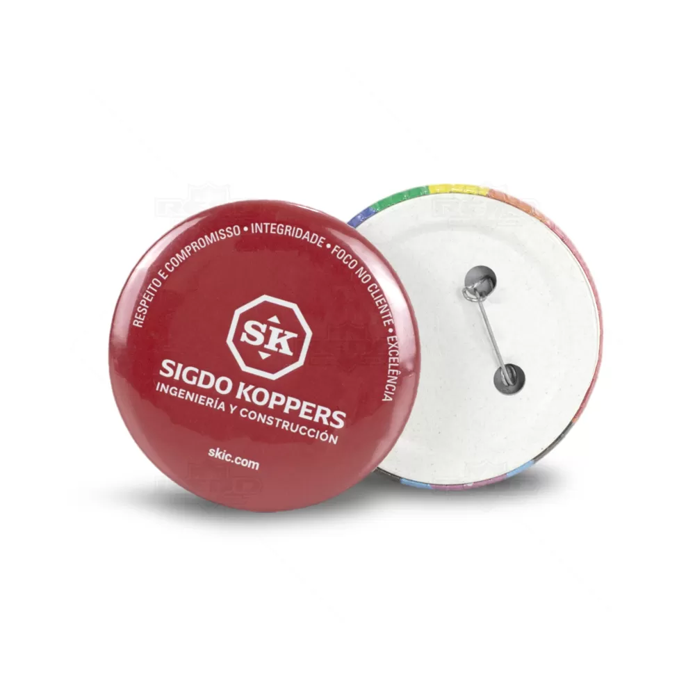 Botton de metal personalizado com impressão em papel fotográfico de alta resolução e papel filme transparente por cima da impressão proporcionando um acabamento brilhante. Possui alfinete traseiro para fixação em malas, mochilas, camisetas, bonés e uniformes. Ideal para divulgar sua empresa em eventos corporativos, brindes personalizados e campanhas promocionais.