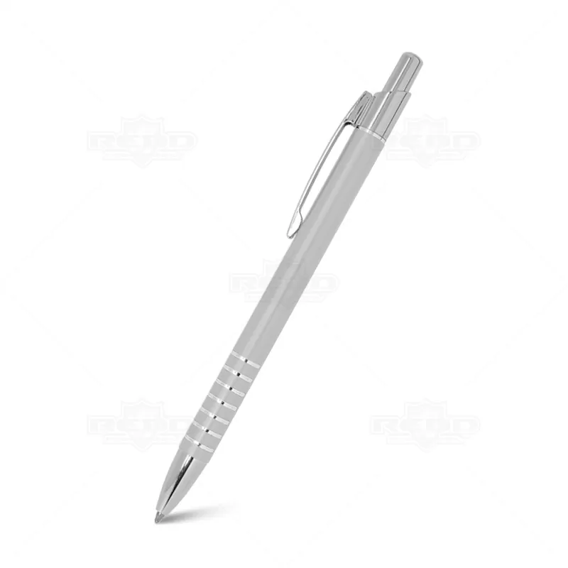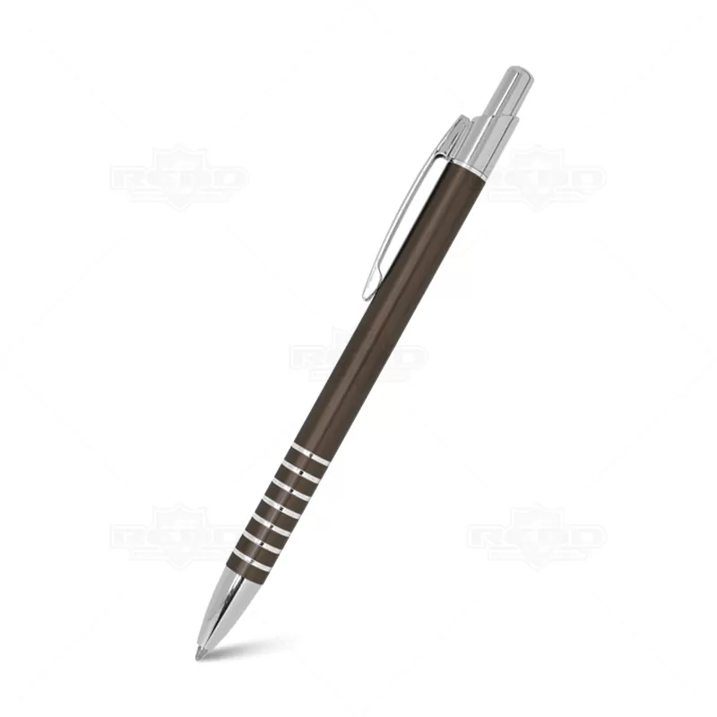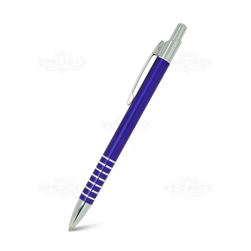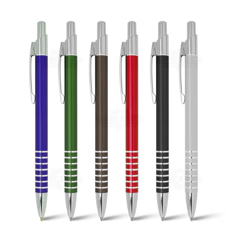 Caneta de metal personalizada com acabamento diferenciado, possui detalhes em anéis cromados, clip de metal, esferográfica azul e acionamento da escrita através do click. Ideal para divulgar sua empresa em eventos corporativos, brindes personalizados e campanhas promocionais.