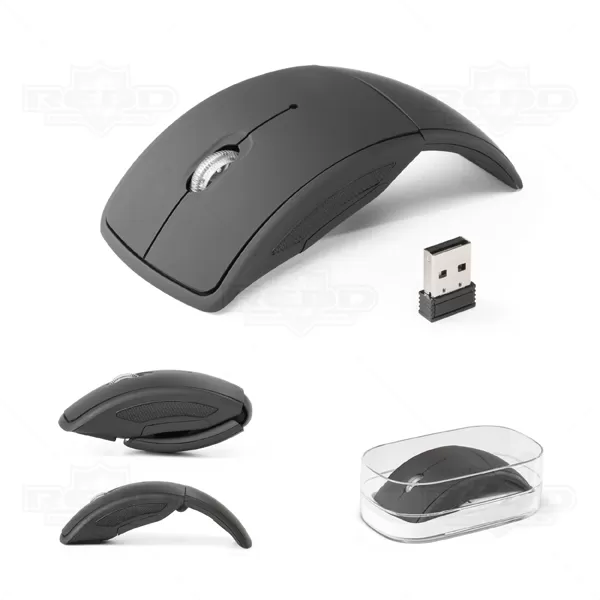 Mouse wireless dobrável 2.4G dobrável produzido em ABS com acabamento emborrachado.Ideal para brindes promocionais e eventos corporativos. Acompanha 2 pilhas AAA e embalagem transparente.