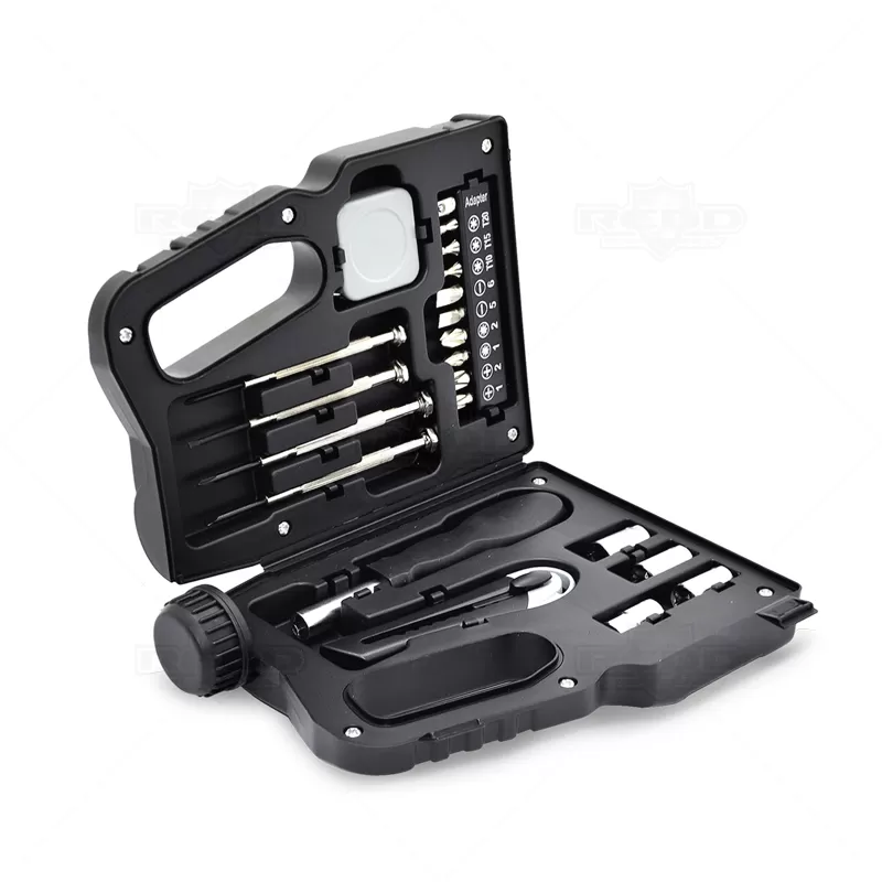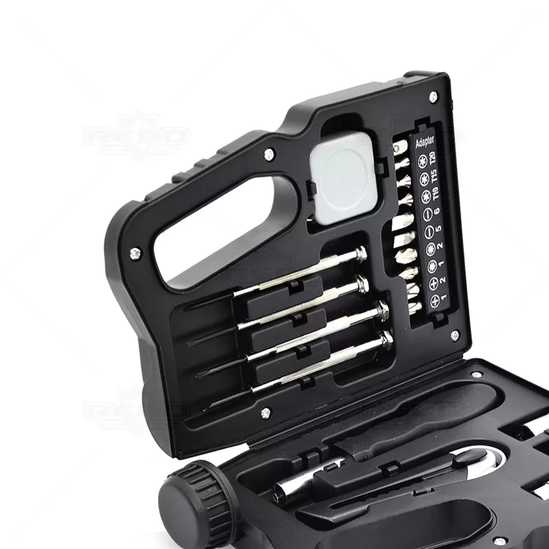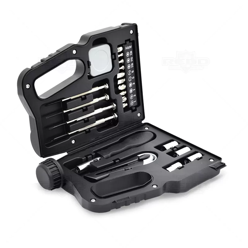 Kit ferramentas personalizado formato galão de óleo com 21 peças. Possui 1 trena de 1 metro, 1 estilete, 1 adaptador de chave de boca,10 pontas de chave, 4 bocais de 7/8/9/10 mm, 2 chave de fendas e 2 chave philips. Ideal para pequenos reparos. Ótima opção para brindes promocionais e eventos corporativos.