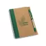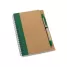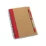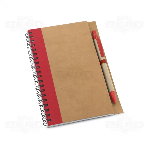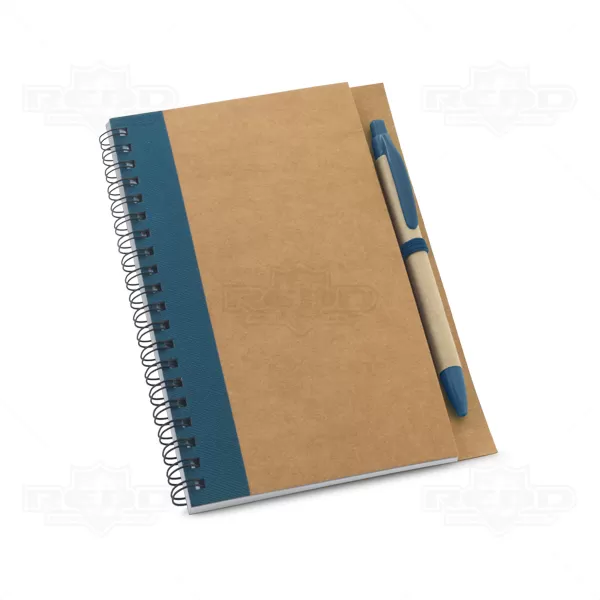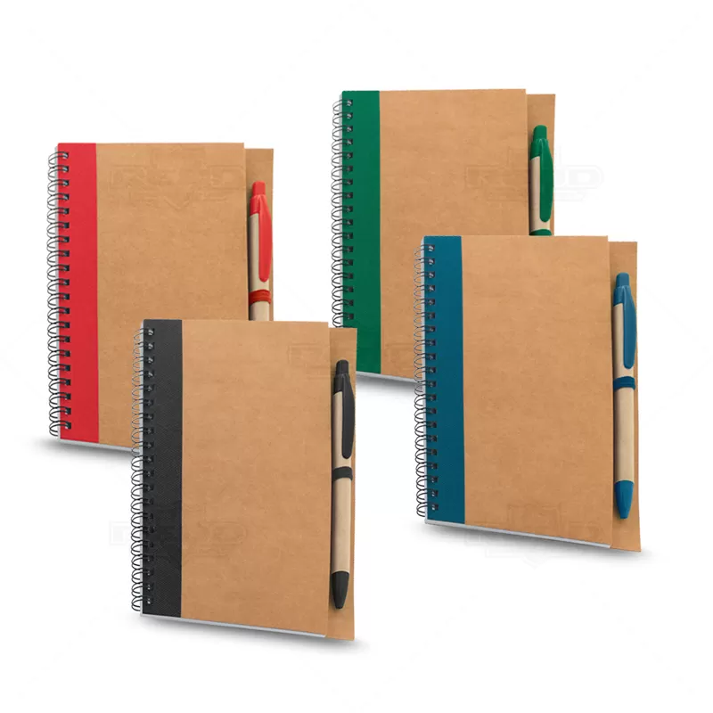 Bloco de anotações personalizado com caneta esferográfica de escrita na cor azul, capa em papel kraft com detalhe colorido à esquerda, encadernação wire-o, elástico lateral para suporte de caneta e aproximadamente 70 folhas não pautadas em papel reciclado. Ideal para brindes promocionais e eventos corporativos.