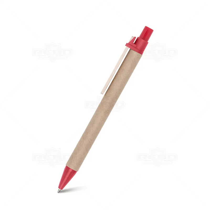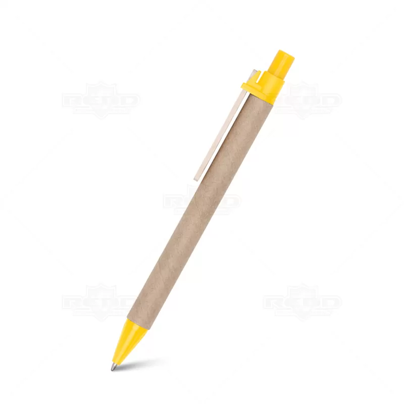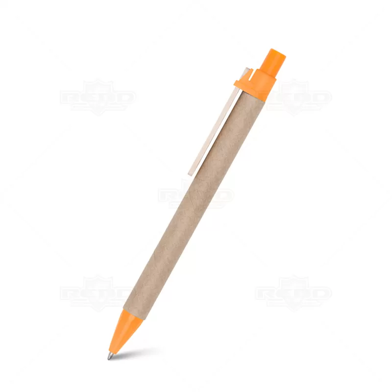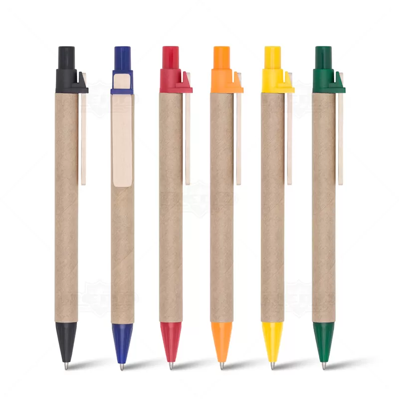 Canetas personalizada produzida em 100% papel reciclado, possui ponteira plástica, escrita na cor azul com acionamento no click e clip de madeira. Ideal para brindes promocionais e eventos corporativos.