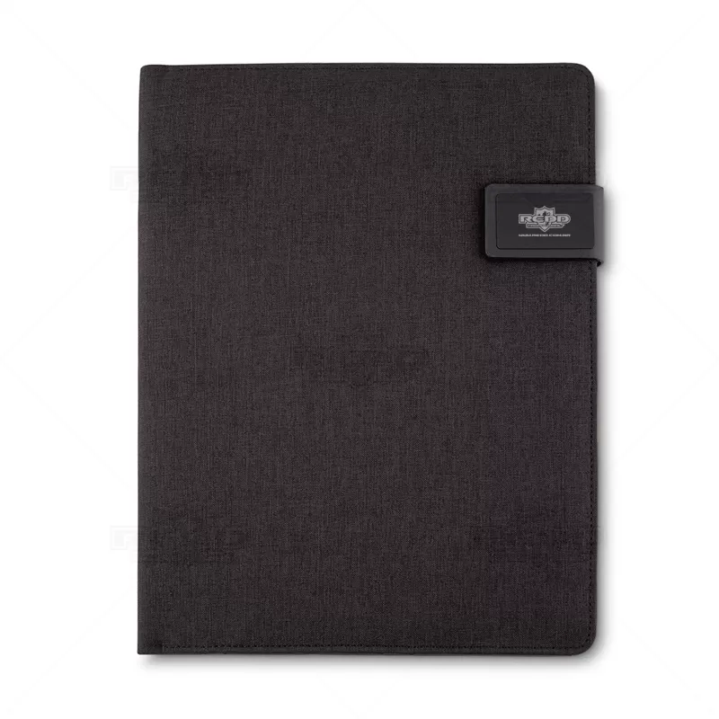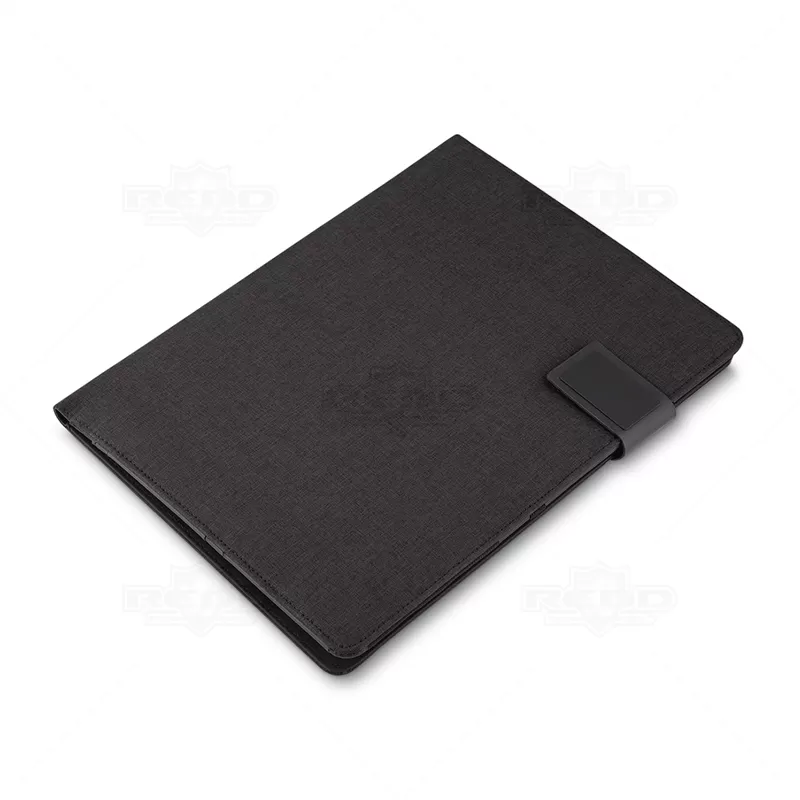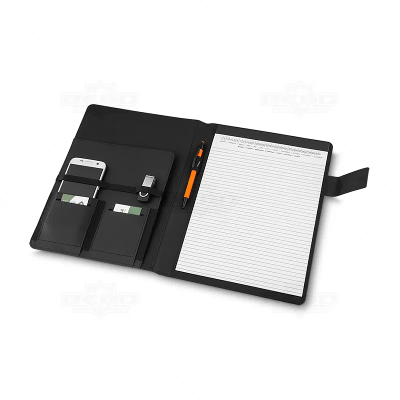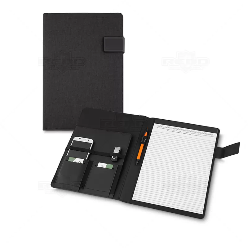 Pasta executiva personalizada, em tamanho A4, produzida em tecido sintético, com fechamento magnético e placa de metal com acabamento emborrachado, Possui 20 folhas pautadas com calendário mensal e semanal, 2 compartimentos para cartões, porta caneta (não incluso), porta documentos, compartimento para celular e objetos. Ideal para brindes promocionais e eventos corporativos. Objetos decorativos não acompanham o produto.