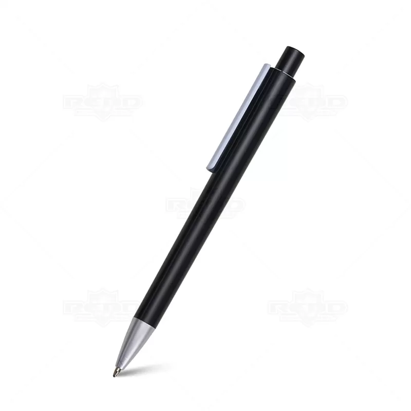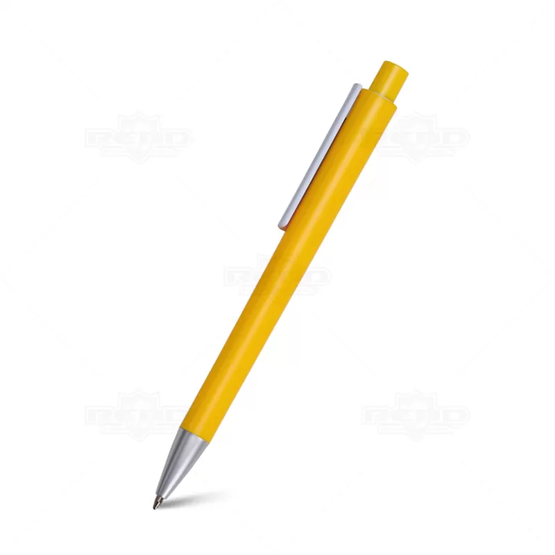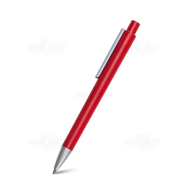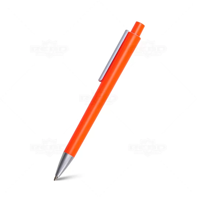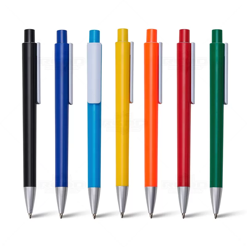 Caneta plástica personalizada com clip personalizado em um design moderno e inovador, possui esferográfica azul e acionamento da ponteira por click. Ideal para brindes promocionais e eventos corporativos.