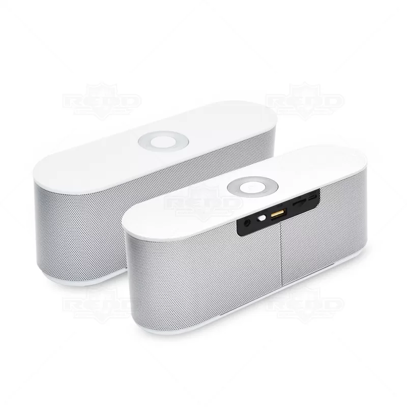 Caixa de som personalizada com acabamento em PVC resistente, base antiderrapante e proteção do auto falante em metal. Possui função de atender chamadas, controles intuitivos fáceis de usar, alta qualidade de som com tecnologia Wi-Fi e longa duração da bateria, distância de transmissão de aproximadamente 10m via Bluetooth, potência nominal 3w + 3w, duração 5 a 8 horas, 80 decibéis, cabo USB/micro USB e tempo de carregamento de 3 a 4 horas. Ideal para brindes promocionais e eventos corporativos.
