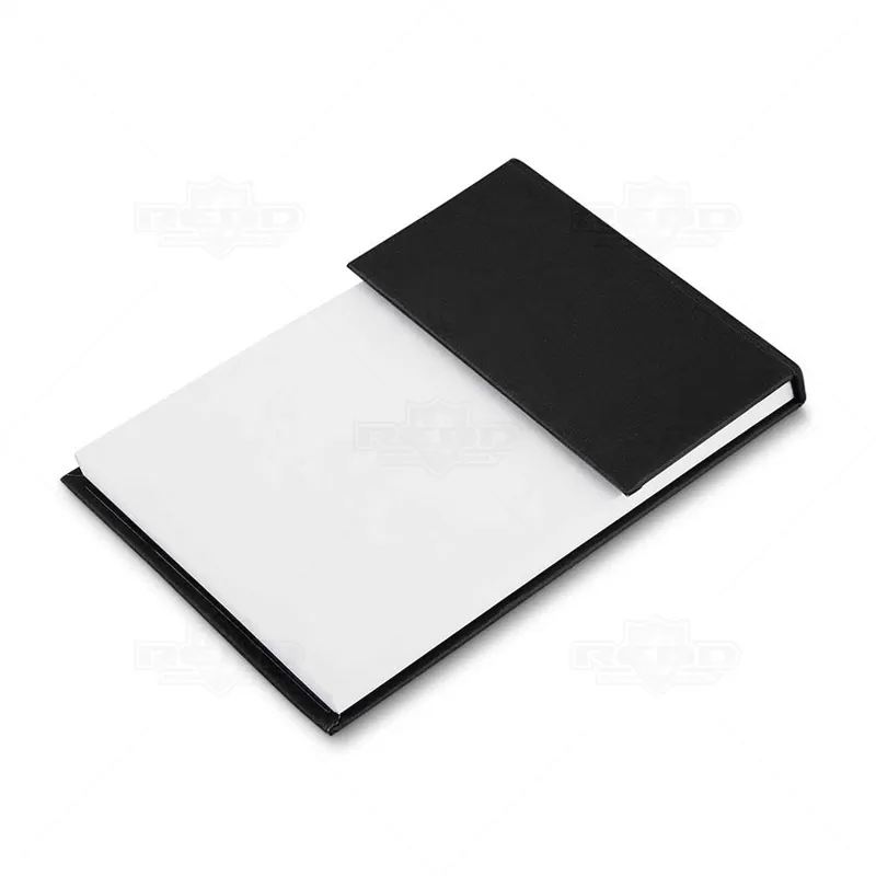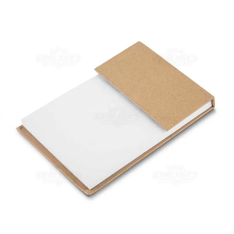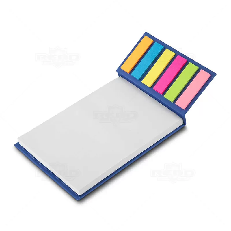 Bloco de anotações personalizado, com aproximadamente 80 folhas brancas sem pautas e 6 cores de autocolantes com aproximadamente 25 folhas cada. Ideal para brindes promocionais e eventos corporativos.