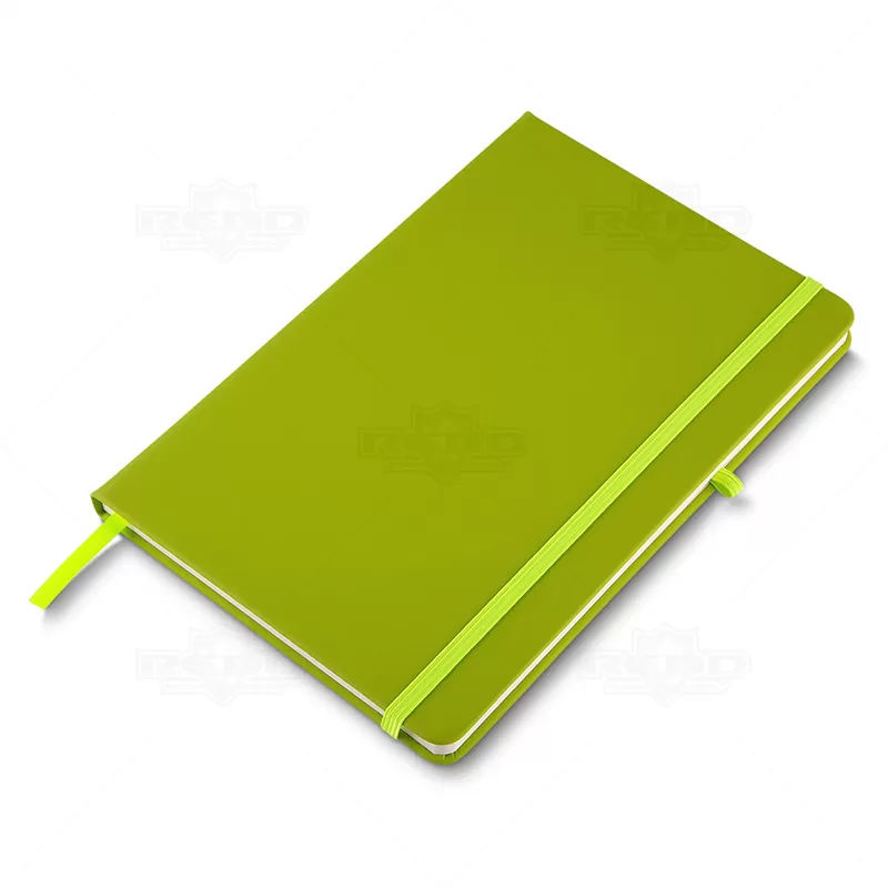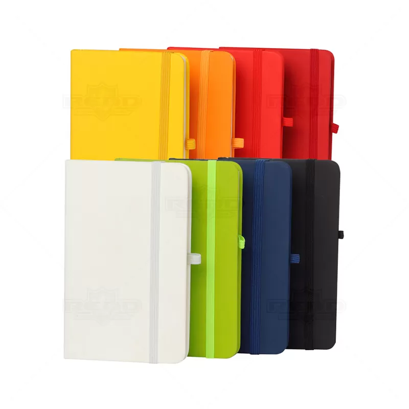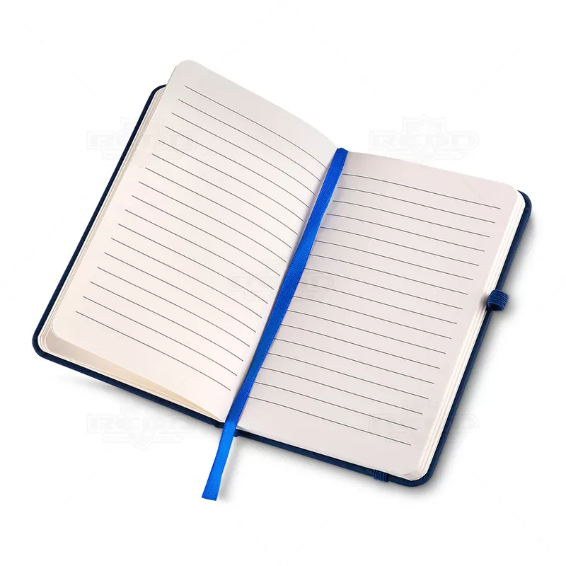 Bloco de anotações personalizado, com capa dura em material sintético, possui suporte para caneta (não inclusa), elástico para fechamento, aproximadamente 80 folhas pautadas na cor marfim e marcador de página em fita de cetim na cor da capa. Ideal para brindes promocionais e eventos corporativos. *Obs: As cores do produto podem apresentar variações.