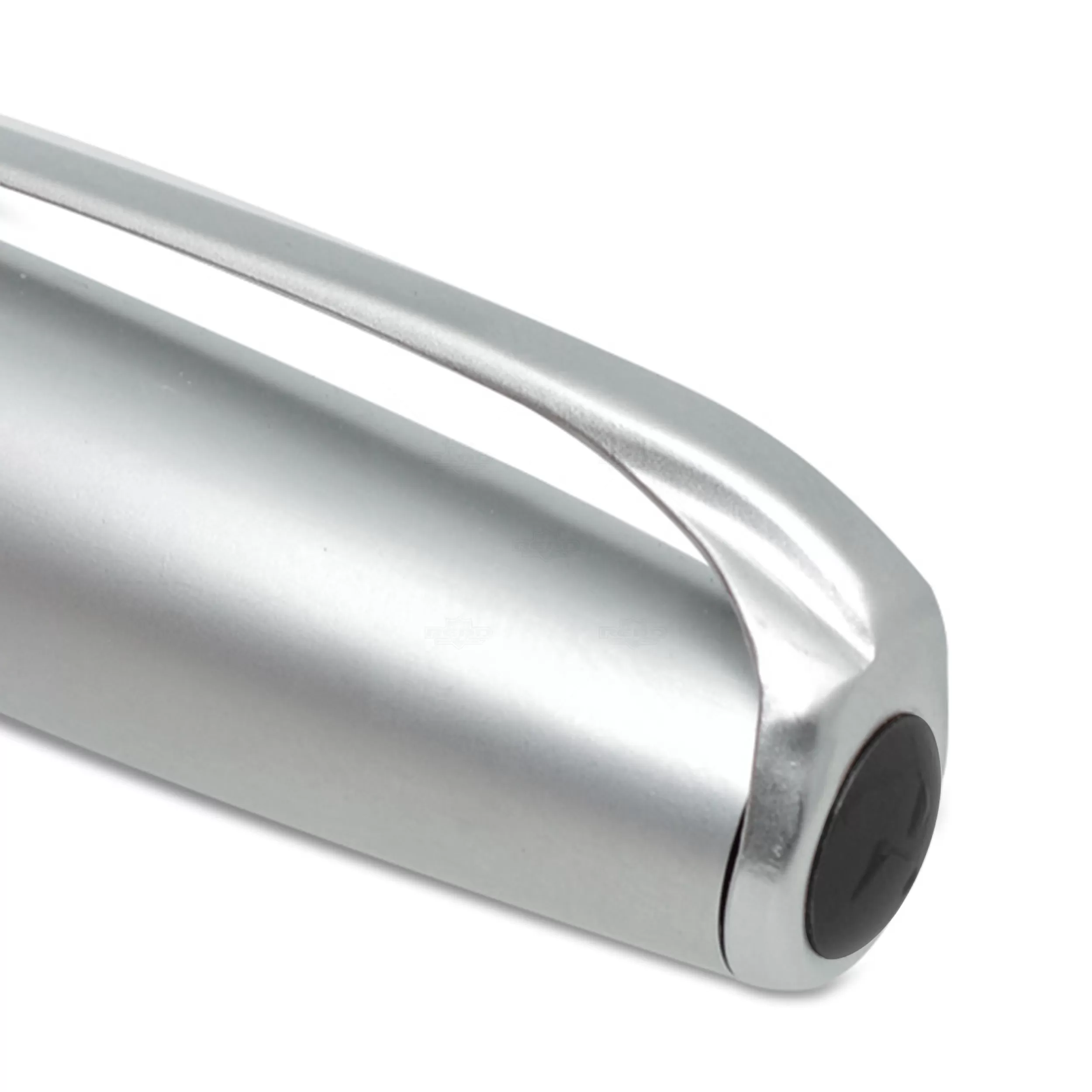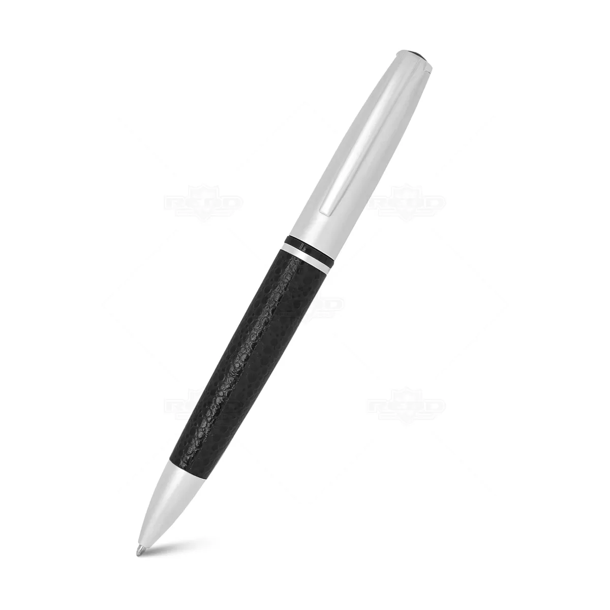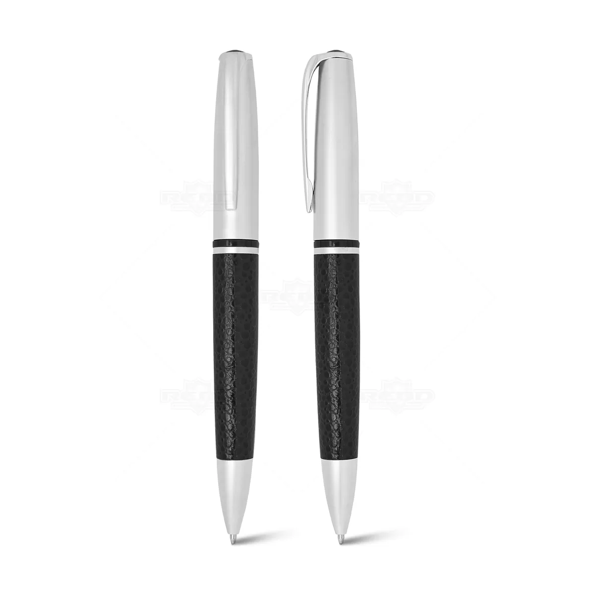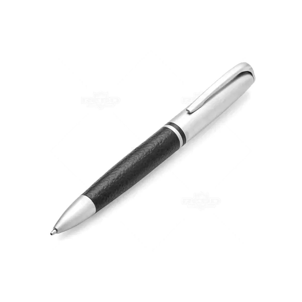 Caneta de metal personalizada com detalhes em couro sintético, possui clip de metal com detalhe superior na mesma cor do corpo, esferográfica na cor azul e acionamento da escrita por giro. Ideal para divulgar sua empresa em eventos corporativos, brindes personalizados e campanhas promocionais.