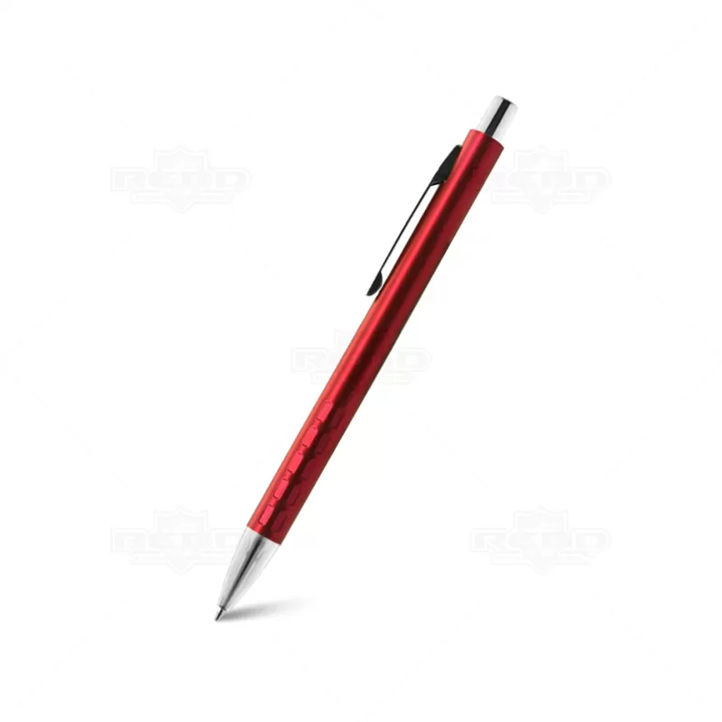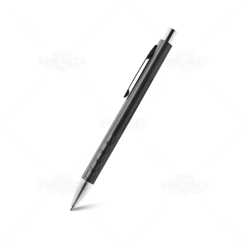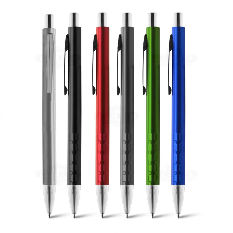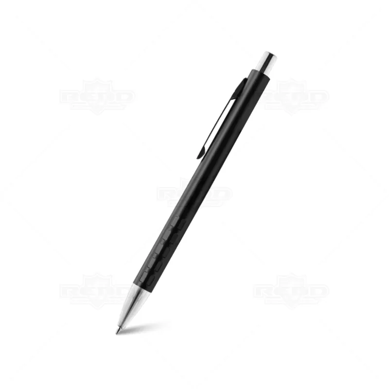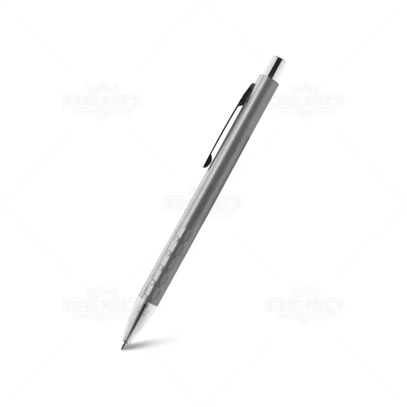 Caneta de Metal personalizada, com reentrâncias na parte inferior para maior aderência durante a escrita, clip de metal, esferográfica na cor azul e acionamento por click. Ideal para brindes promocionais e eventos corporativos.