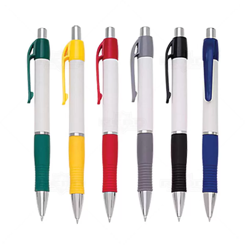 Caneta plástica personalizada com clip injetado, detalhe emborrachado na parte inferior da caneta e escrita na cor azul. Ideal para brindes promocionais e eventos corporativos.