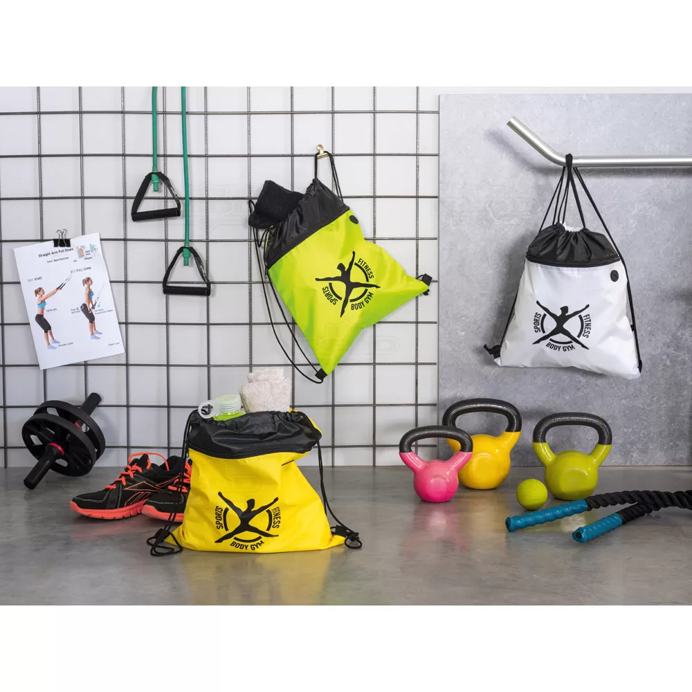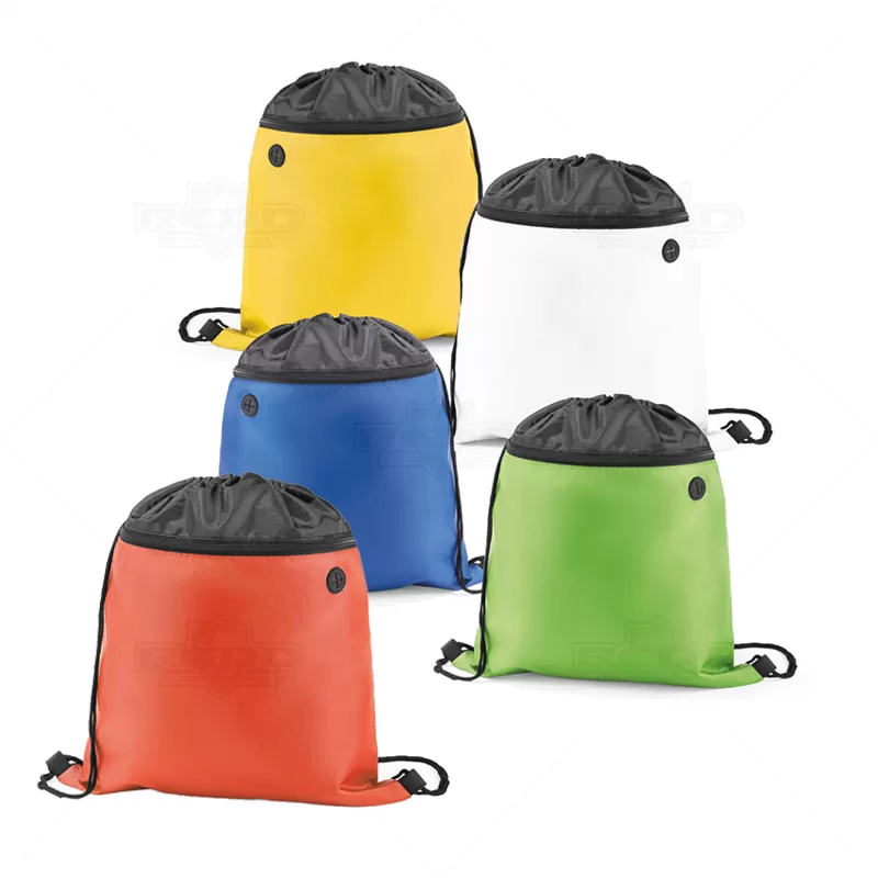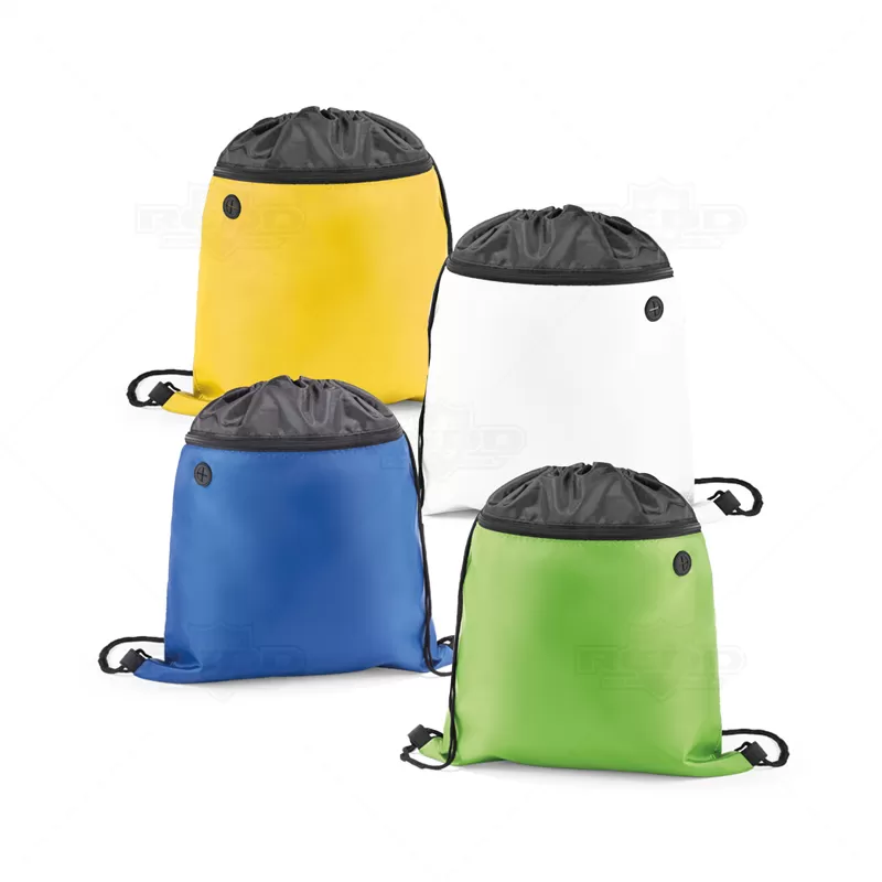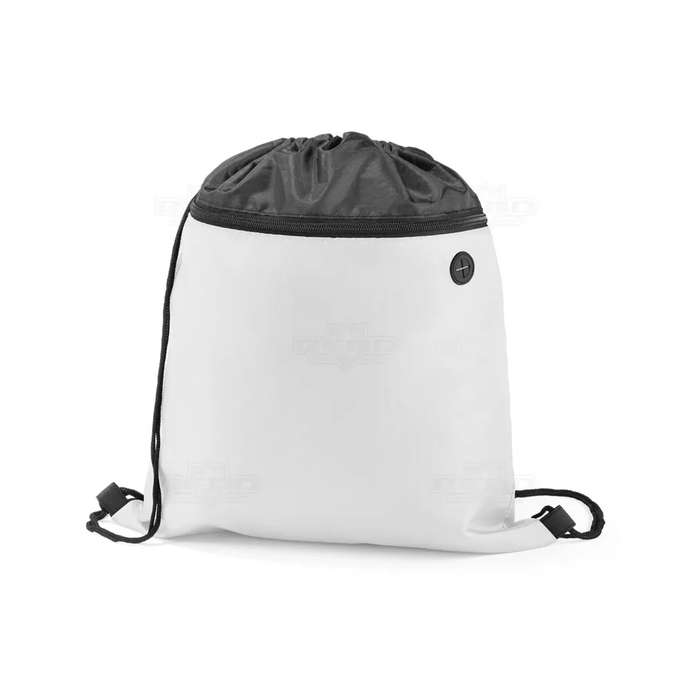 Mochila saco personalizada produzida em nylon 210 com alças de algodão, possui bolso frontal e saída para o fone de ouvido. Ideal para eventos esportivos, brindes promocionais e eventos corporativos. Imagem ilustrativa.