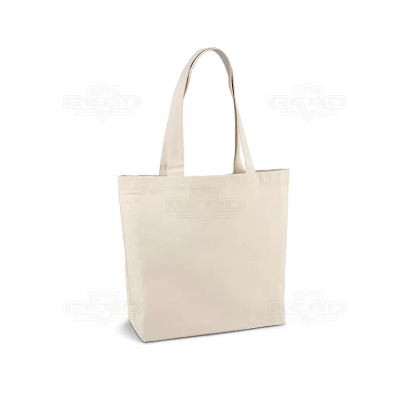 Sacola personalizada em 100% algodão (180 g/m²) com alças de 65 cm e amplo espaço interno. Ideal para brindes promocionais e eventos corporativos.