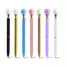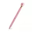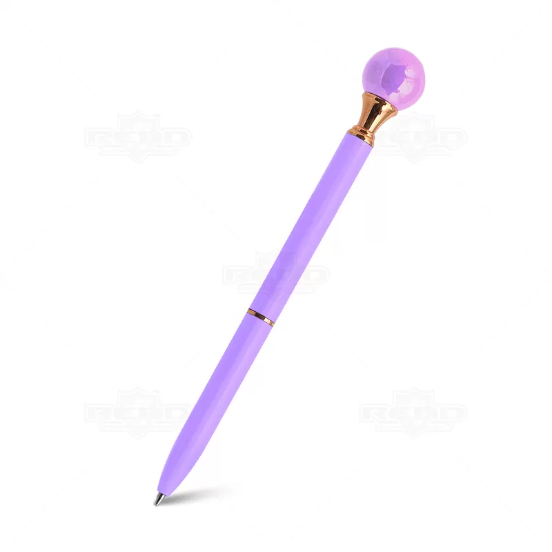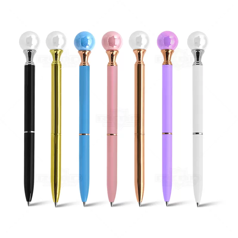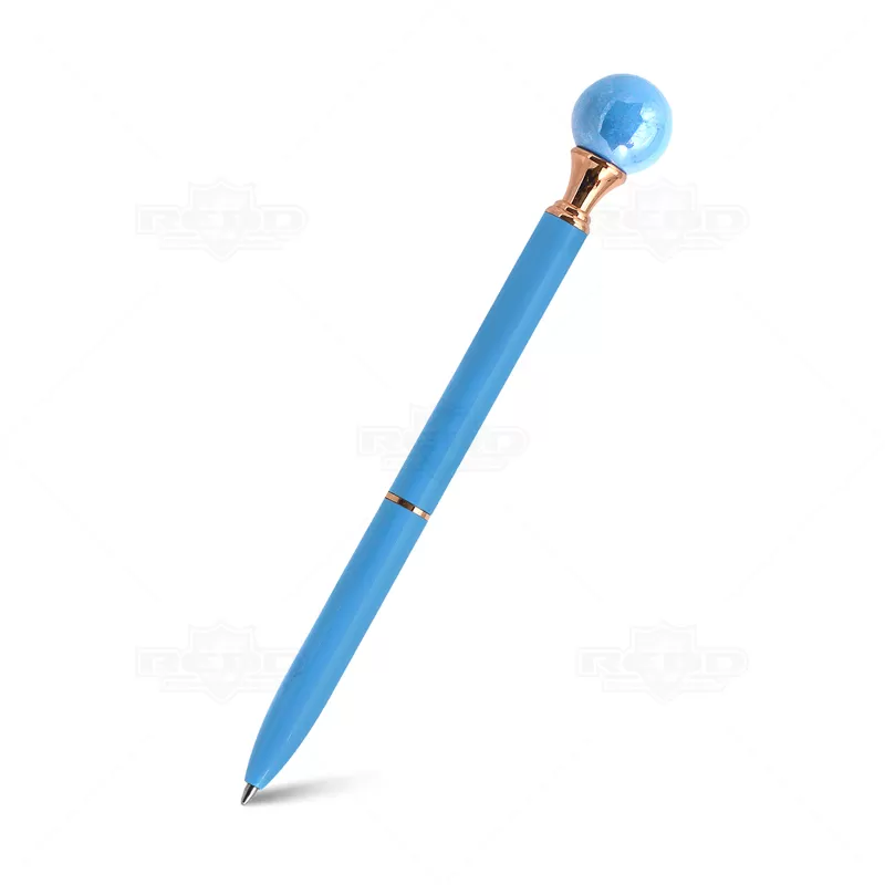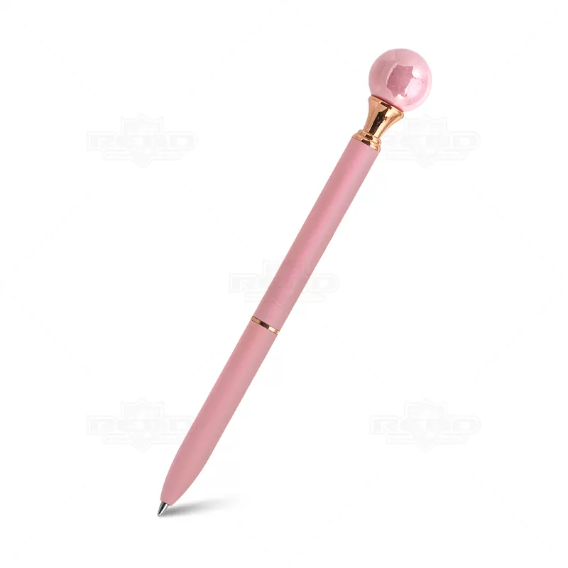 Caneta de metal personalizada, conta com detalhe simulando uma pérola na parte superior da caneta. Possui um anel no corpo e escrita na cor azul acionada através do sistema giratório. Ideal para brindes personalizados e eventos corporativos.
