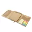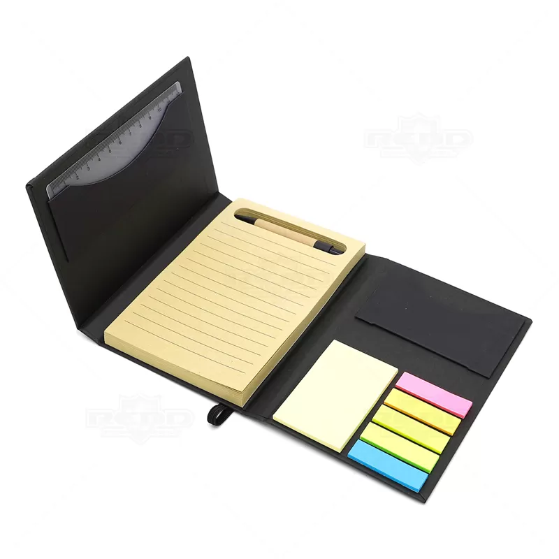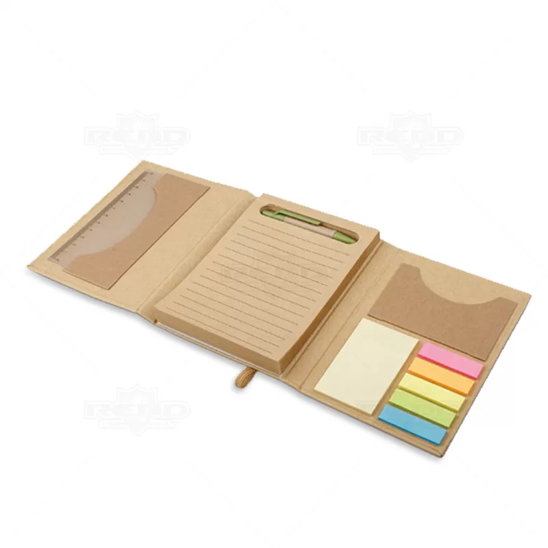 Bloco de anotações personalizado produzido em papel kraft, com fechamento em elástico para maior segurança e praticidade no transporte. Conta com aproximadamente 80 folhas pautadas em papel reciclado, ideais para registros organizados e anotações diárias. Acompanha régua de 12 cm em material translúcido, caneta esferográfica com corpo em papel kraft e detalhes plásticos, oferecendo escrita confortável e sustentável. Possui ainda porta-cartões integrado e conjunto de cinco blocos autoadesivos coloridos, perfeitos para marcações rápidas e organização visual de documentos e agendas. O design funcional e compacto facilita o uso em reuniões, treinamentos, estudos e atividades corporativas, além de oferecer ampla área de personalização na capa para aplicação de logotipo ou mensagem. É uma escolha versátil e de apelo ecológico, ideal como brinde promocional em eventos, ações de marketing e campanhas institucionais, reforçando a marca de forma útil e sustentável no cotidiano do público-alvo.