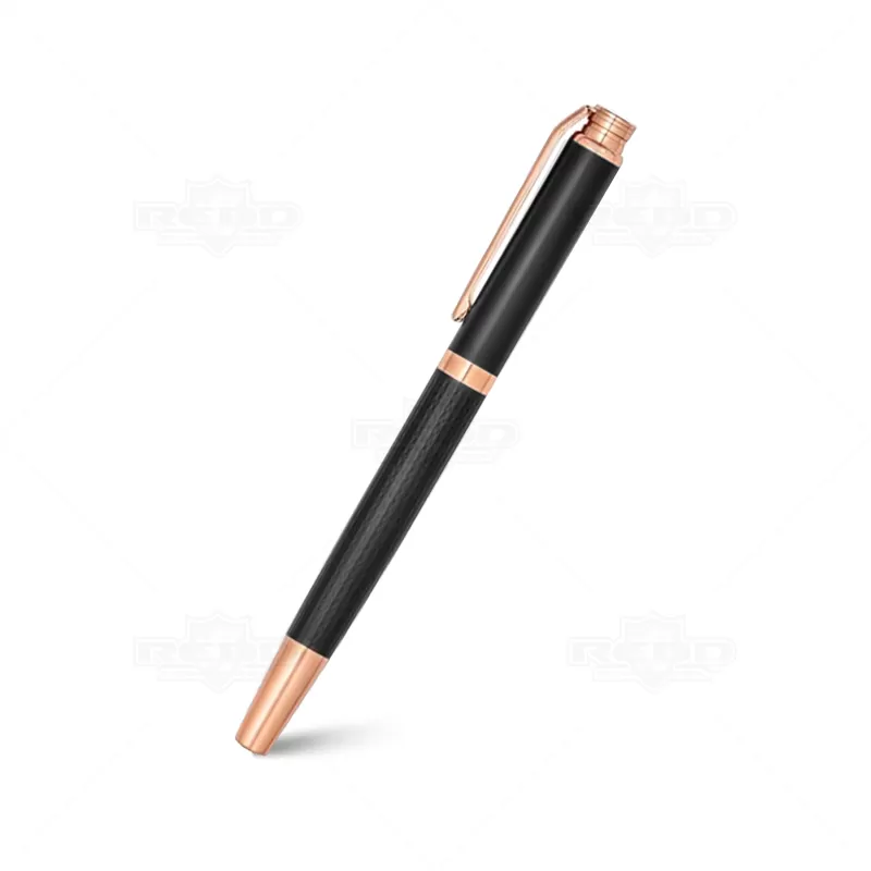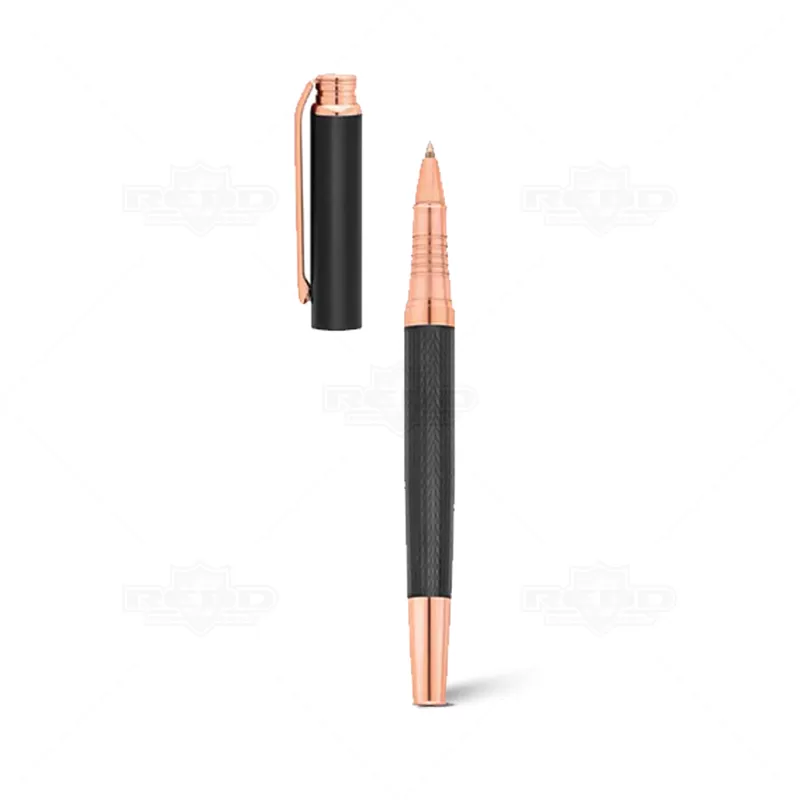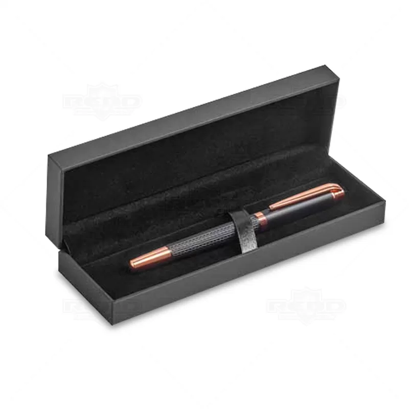 Caneta personalizada produzido em metal com detalhe texturizado no corpo da caneta. Possui escrita preta, clip de metal e tampa destacável. Acompanha 1 estojo com acabamento interno em veludo e almofadado. Contando com duas opções sendo uma toda preta e a outra com detalhe acobreado Ideal para divulgar sua empresa em eventos corporativos, brindes personalizados e campanhas promocionais.