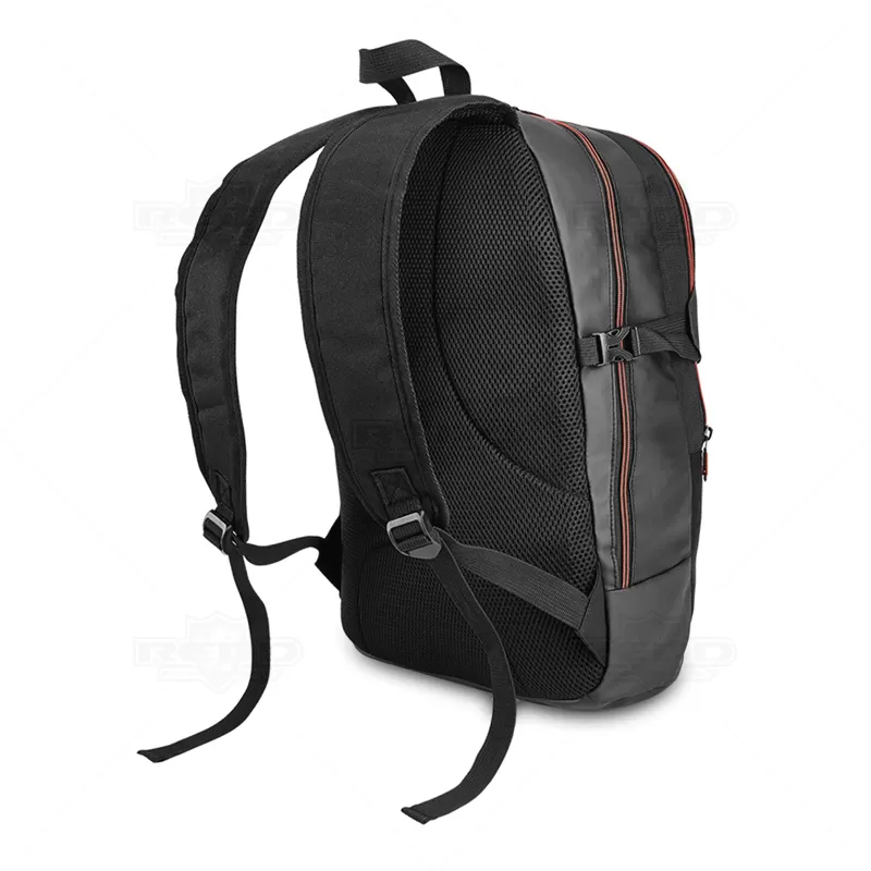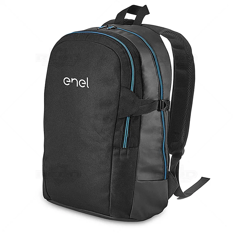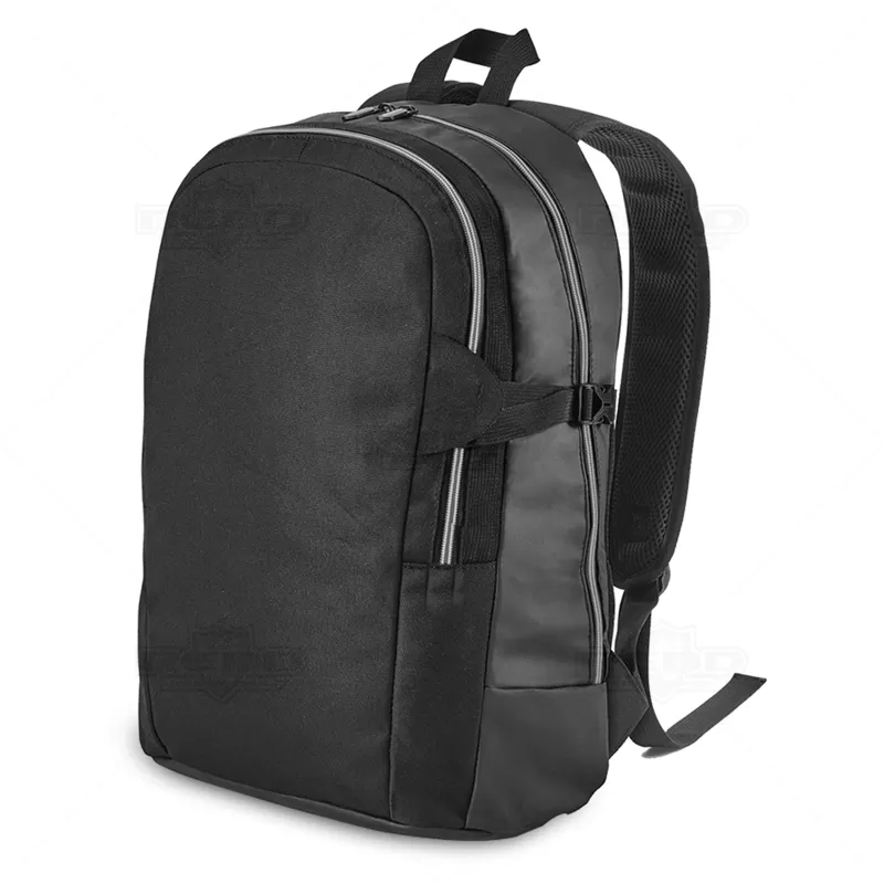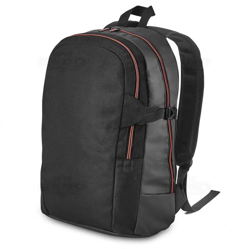 Mochila para notebook personalizado produzida nylon 900D com detalhes em couro sintético. Possui compartimento principal forrado para notebook de até 17", diversos bolso internos para objetos menores, compartimento frontal forrado com fechamento em zíper, alça de mão e alça de ombro almofadadas. Objetos decorativos não acompanha o produto. Ideal para divulgar sua empresa em eventos corporativos, brindes personalizados e campanhas promocionais.
