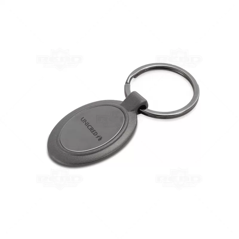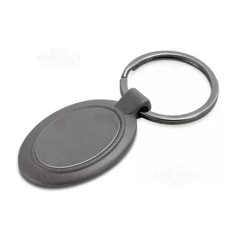 Chaveiro de metal personalizado no formado oval, Possui placa central preta, argola para chaves e acabamento texturado. Acompanha embalagem em caixinha preta. Ideal para eventos promocionais e brindes corporativos.
