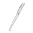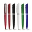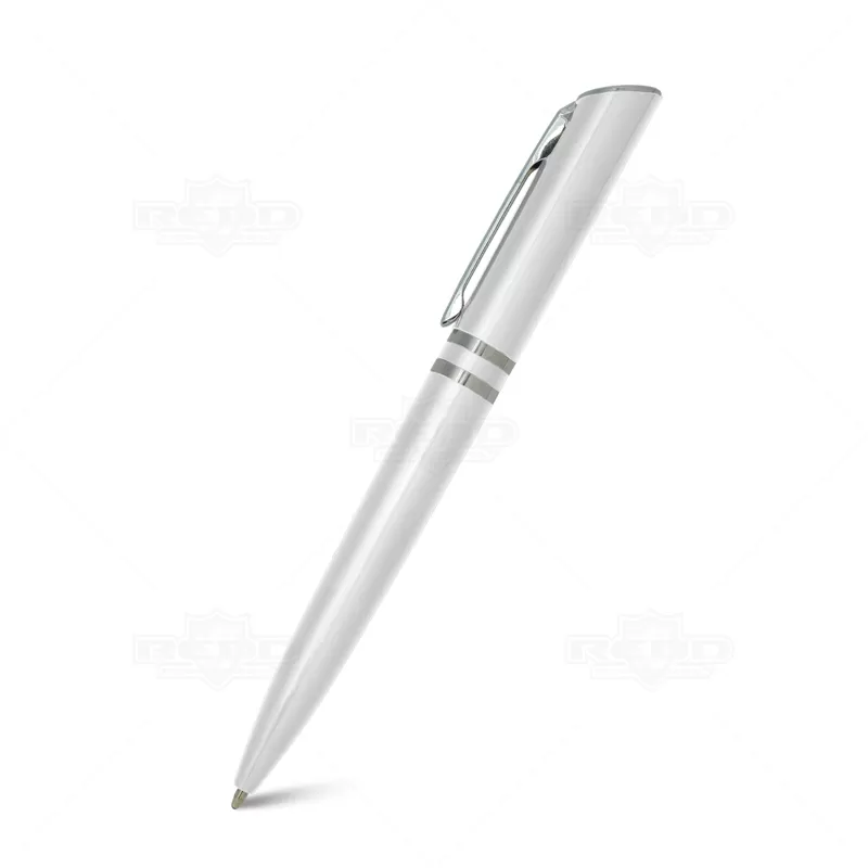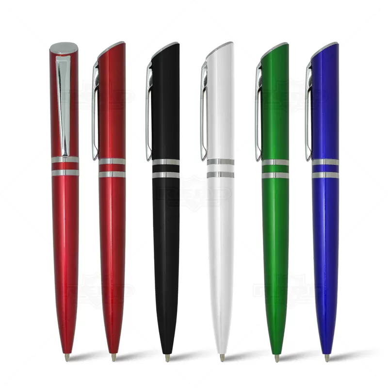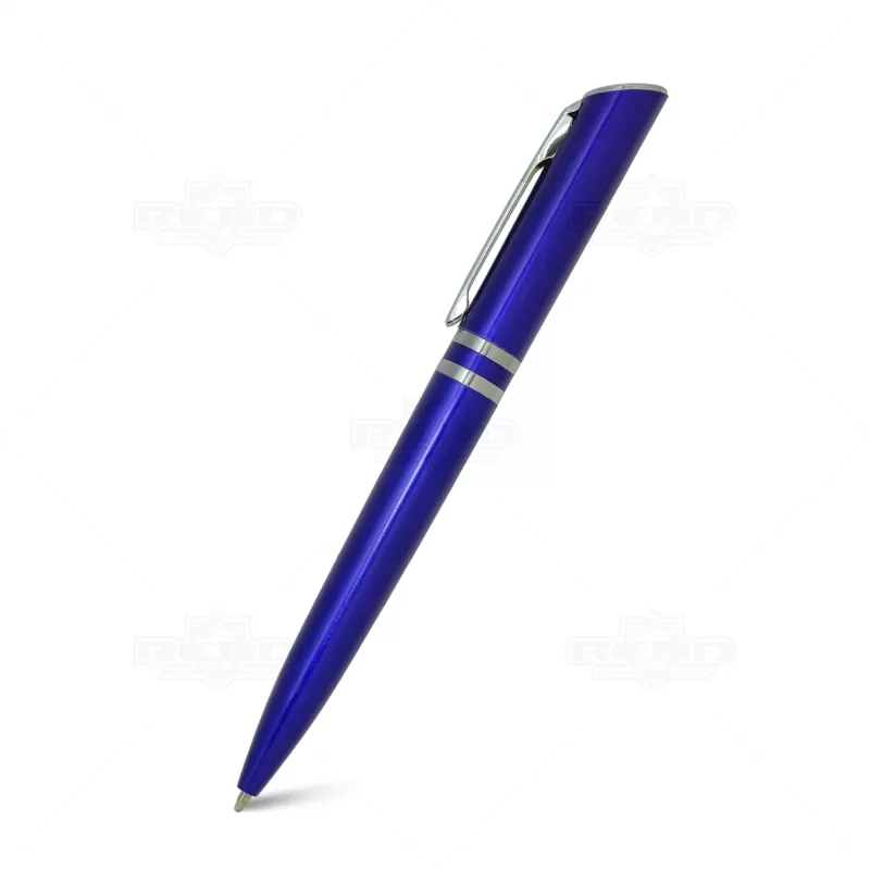 Caneta plástica personalizada com clip de metal, design diferenciado com acionamento giratório, 2 anéis prateado e escrita na cor azul. Ideal para brindes promocionais e eventos corporativos.