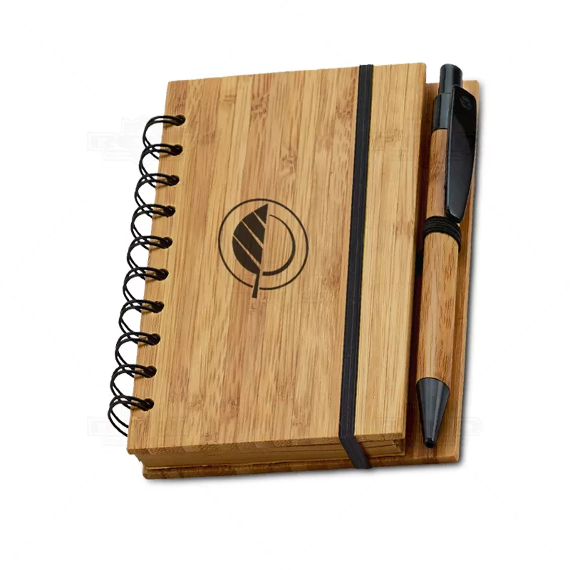 Bloco de anotações personalizado, com capa dura produzida em bambu, possui elástico para fechamento, encadernação em wire-o, caneta esferográfica em bambu com acionamento por click e aproximadamente 70 folhas pautadas de papel reciclado. Ideal para divulgar sua empresa em eventos corporativos, brindes personalizados e campanhas promocionais.