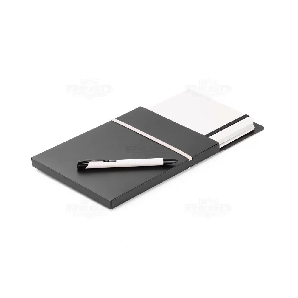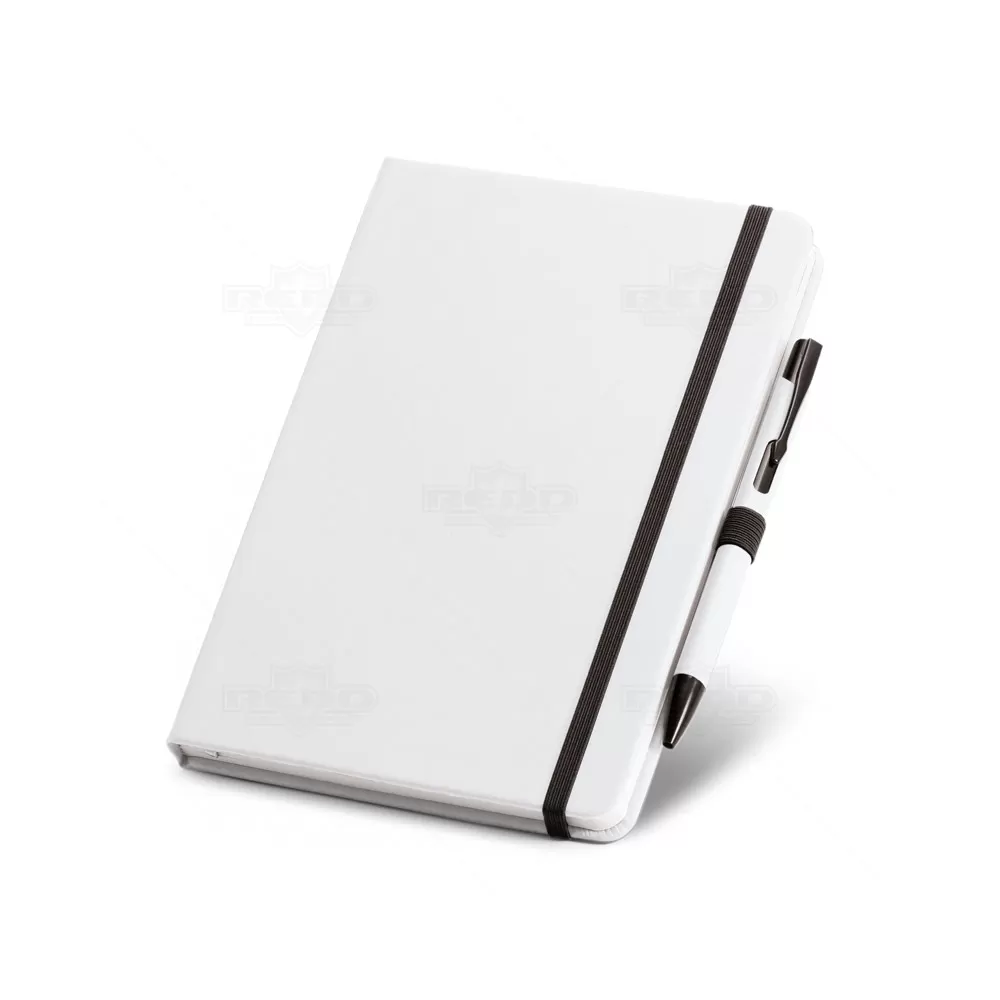 Bloco de anotações personalizado, produzido em material sintético com capa dura, possui aproximadamente 80 folhas não pautadas na cor branca, embalagem presenteável em PP e caneta de metal esferográfica com acionamento por click. Ideal para divulgar sua empresa em eventos corporativos, brindes personalizados e campanhas promocionais.
