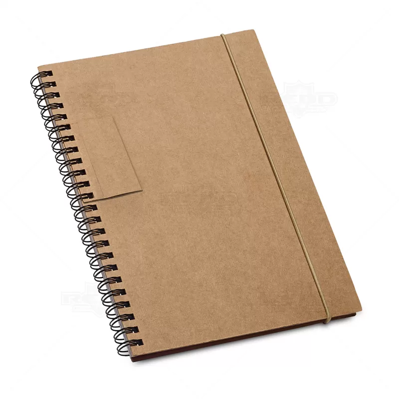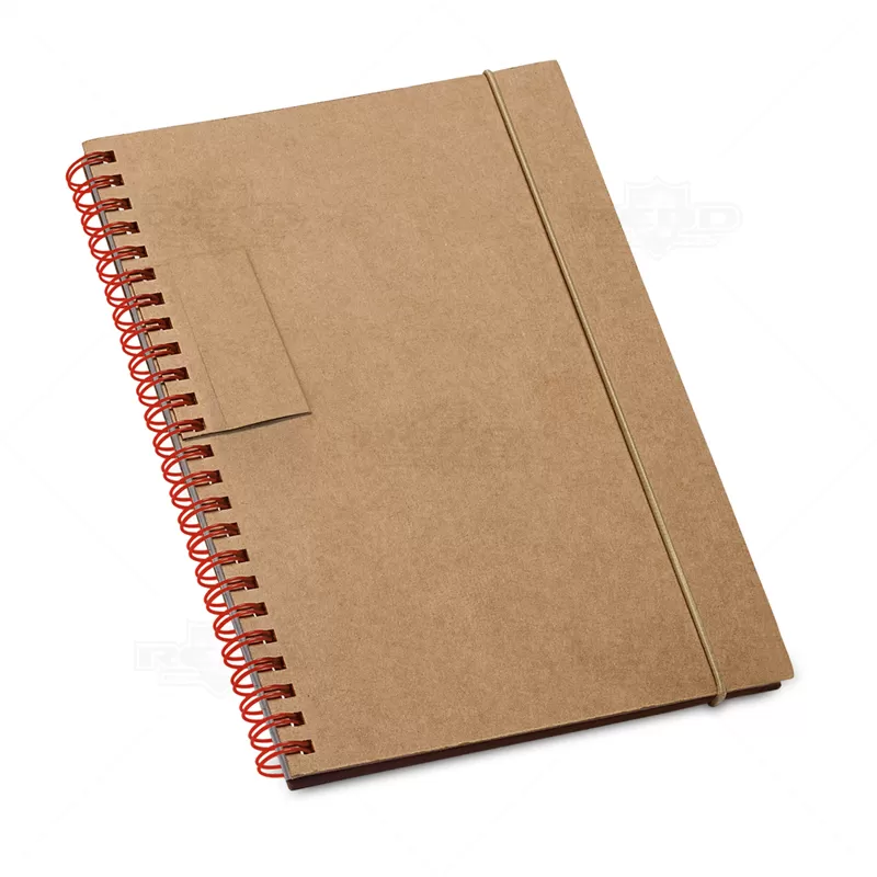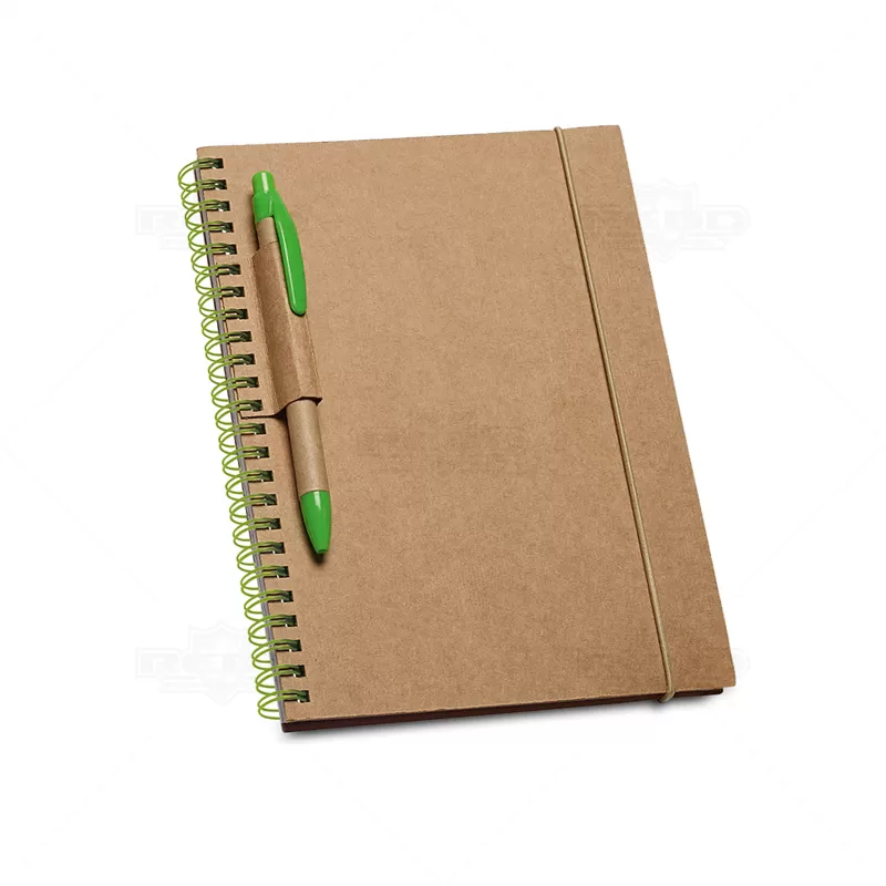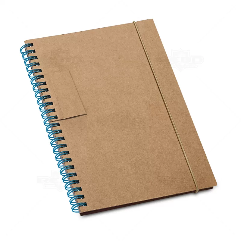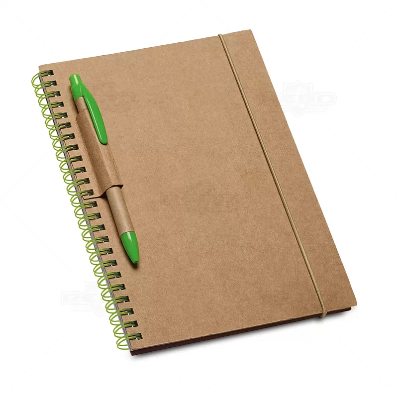 Bloco de anotações personalizado, com capa dura de papel cartão, possui encadernação wire-o, fechamento em elástico, aproximadamente 60 folhas pautadas de papel reciclado e porta caneta de papel cartão na capa frontal. *Caneta Esferográfica não acompanha o produto. Ideal para divulgar sua empresa em eventos corporativos, brindes personalizados e campanhas promocionais.