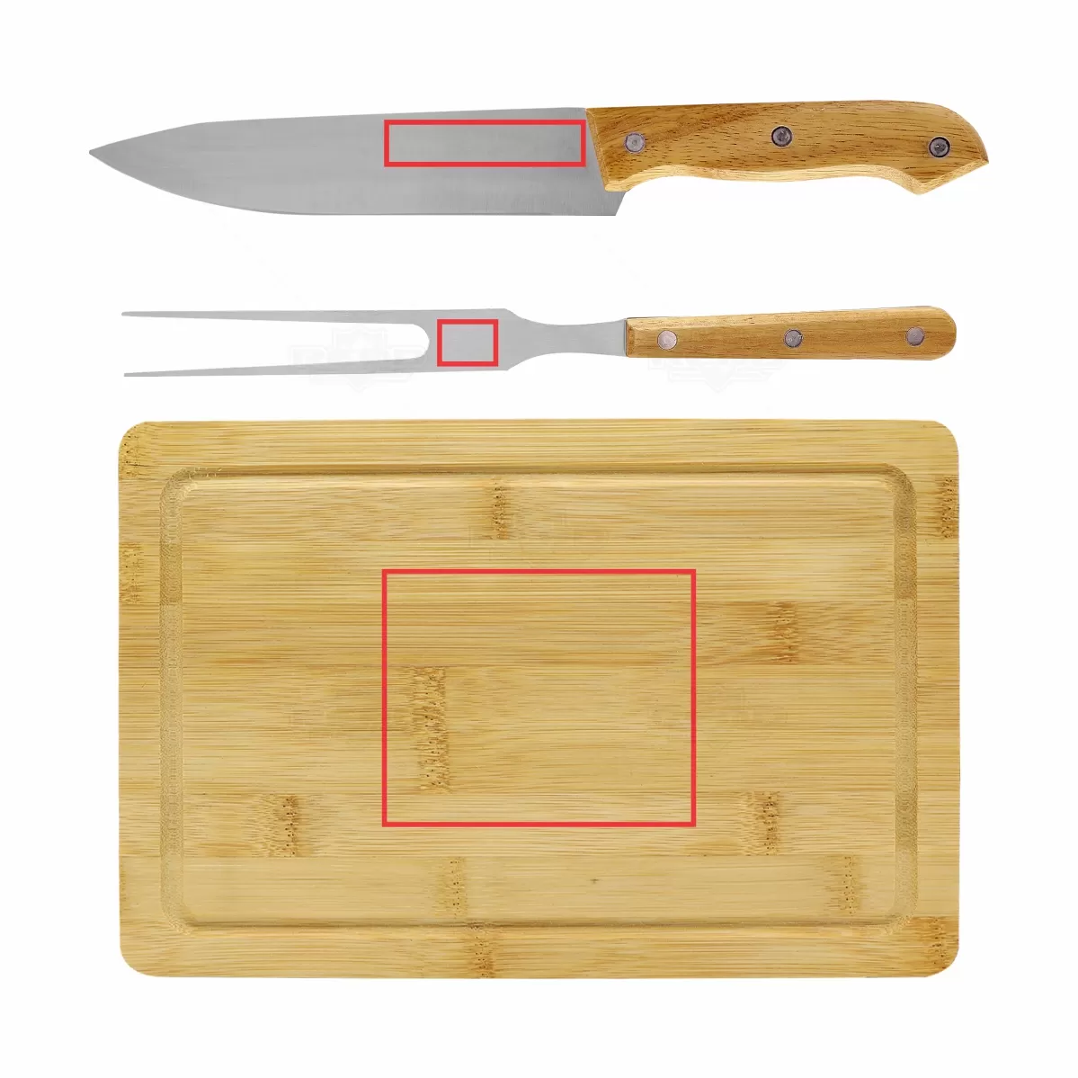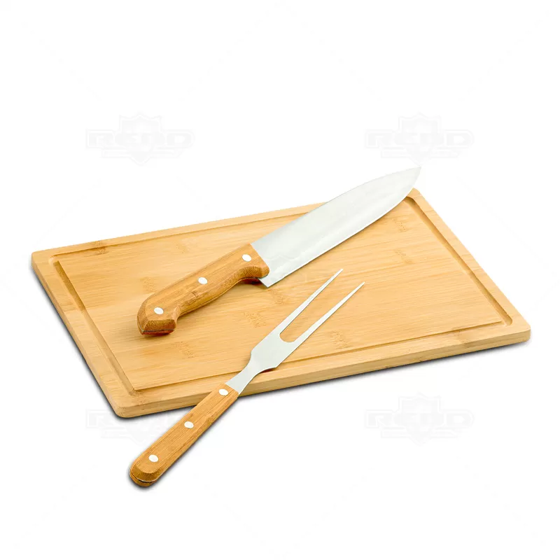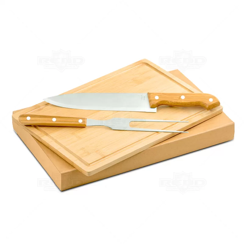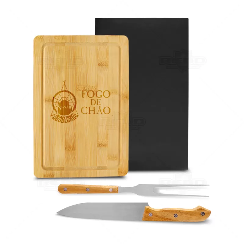 Kit churrasco personalizado com 2 talheres em inox e 1 tábua com acabamento em bambu. Acompanha caixa de papel Kraft. Ideal para divulgar sua empresa em eventos corporativos, brindes personalizados e campanhas promocionais.