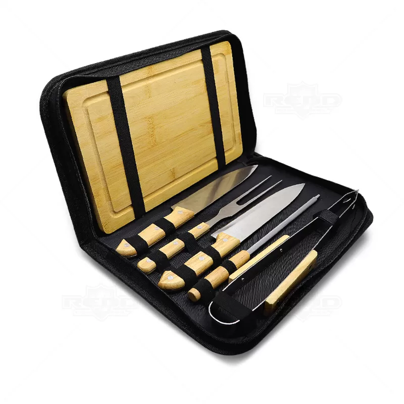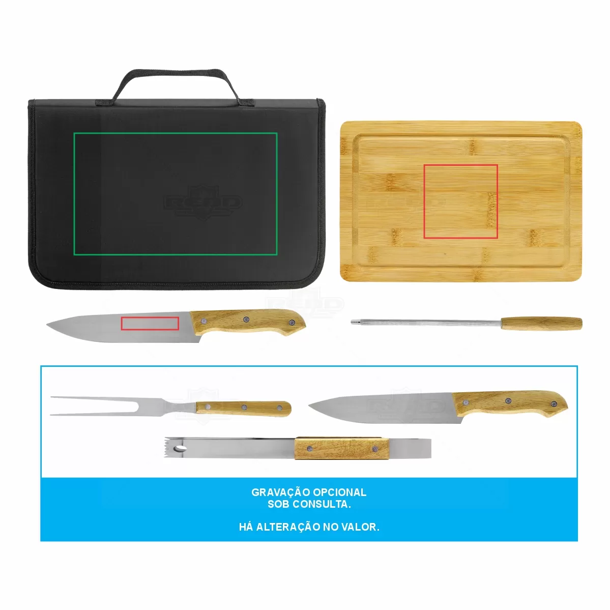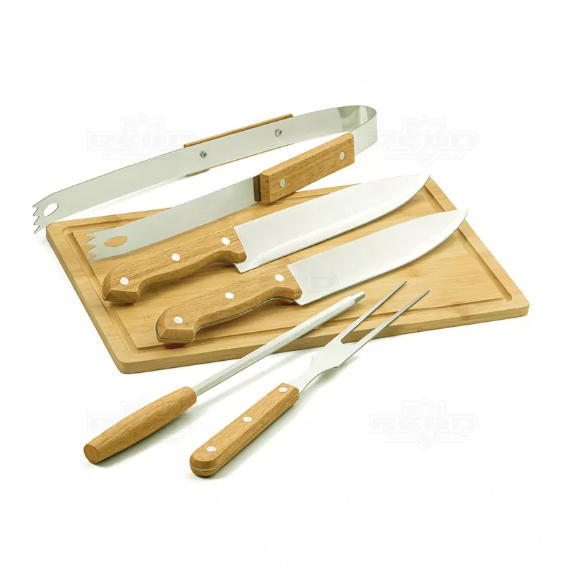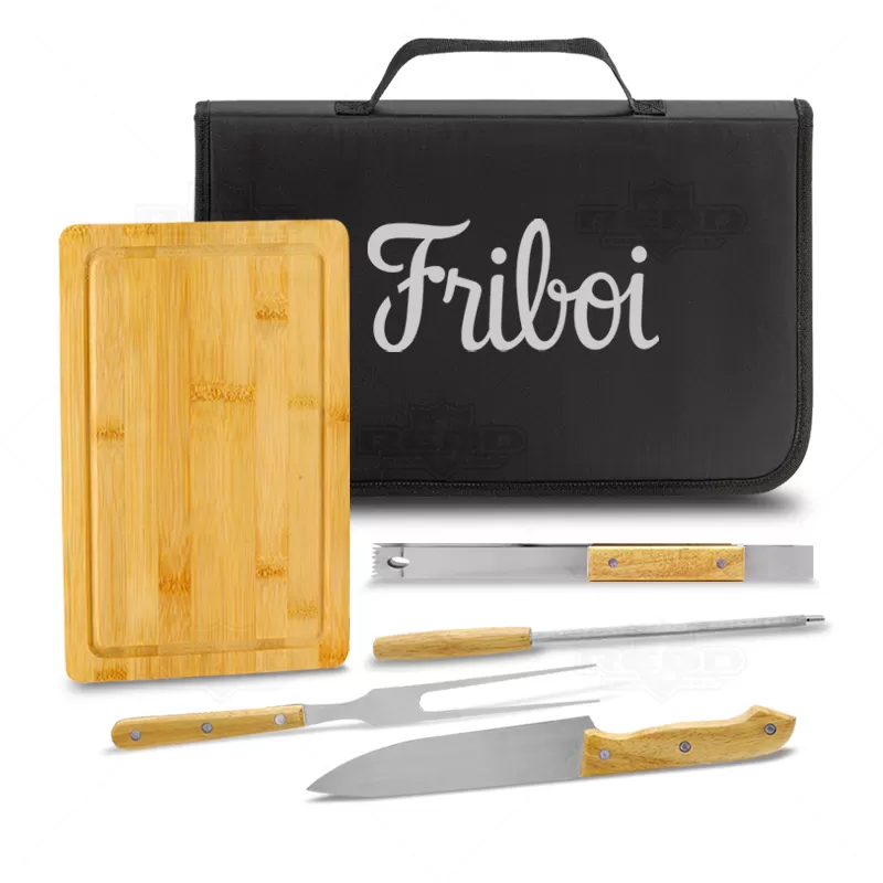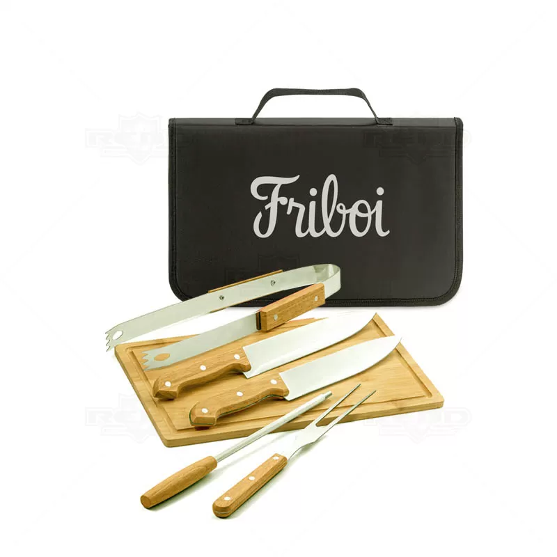 Kit churrasco personalizado com 5 talheres em inox e 1 tábua ambos com acabamento em madeira. Possui maleta em nylon 210D com alça de mão. Contém 2 facas de corte comum, 1 garfo tridente, 1 pegador e 1 chaira para amolar o corte. Ideal para divulgar sua empresa em eventos corporativos, brindes personalizados e campanhas promocionais.