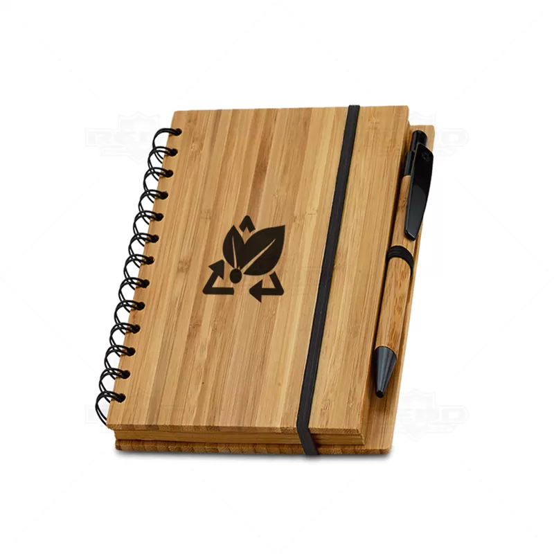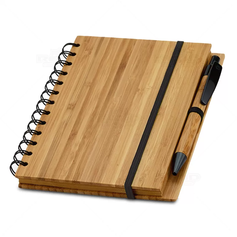 Bloco de anotações personalizado produzido com capa dura em bambu , possui elástico para fechamento, encadernação em wire-o, caneta esferográfica em bambu com acionamento por clik e aproximadamente 70 folhas pautadas de papel reciclado. Ideal para divulgar sua empresa em eventos corporativos, brindes personalizados e campanhas promocionais.