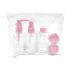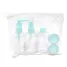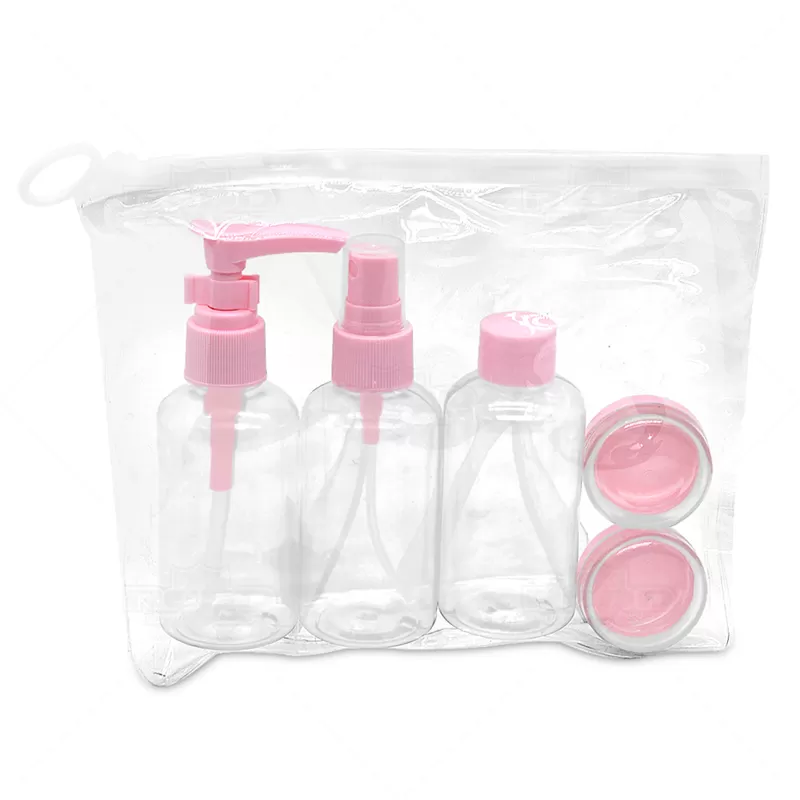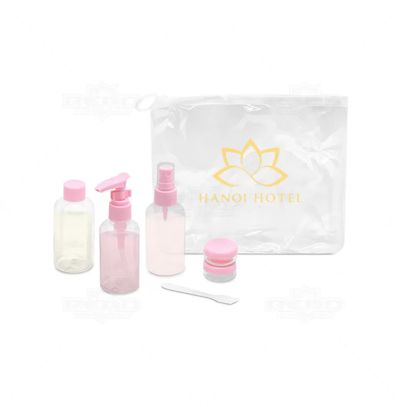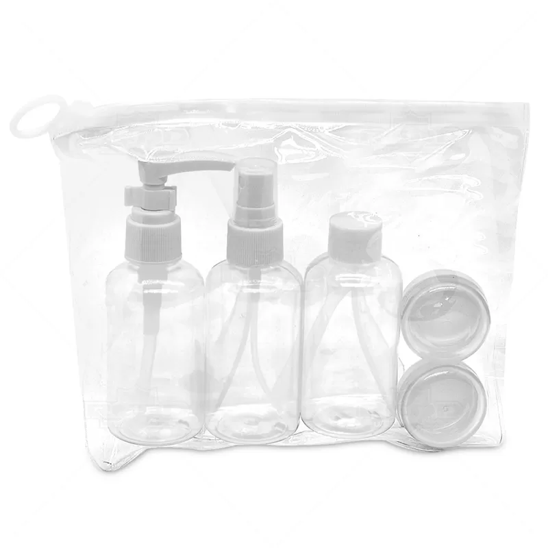 Kit viagem com 6 peças personalizado, constituído por estojo de PVC ziplock e puxador para fechamento, 1 frasco de 80 ml com tampa spray, 1 frasco de 80 ml com tampa rosqueável, 1 frasco de 80 ml com tampa pump, 2 potes de 10 ml com tampa rosqueável e 1 mini espátula na cor fosca. Ideal para divulgar sua empresa em eventos corporativos, brindes personalizados e campanhas promocionais.
