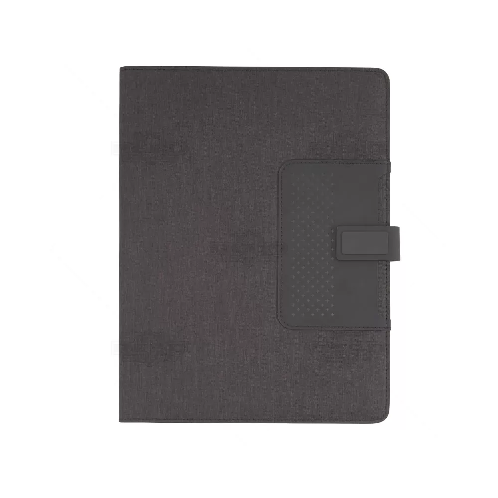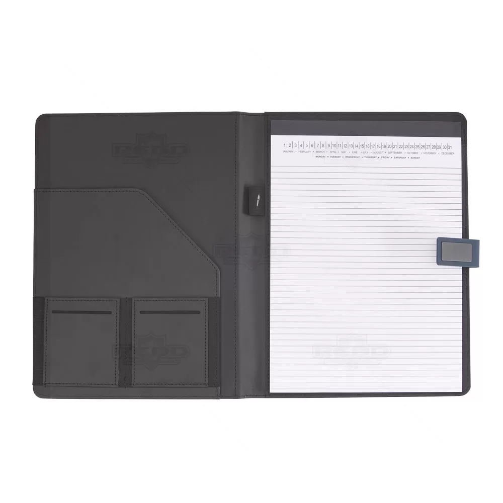 Pasta executiva personalizado, com acabamento almofadado, possui caderno com 20 folhas brancas no formato A4 com pautas, bolso frontal, compartimento interno para documentos, cartões, smartphone e documentos pessoais, porta caneta central (não acompanha) e fecho magnético. Ideal para divulgar sua empresa em eventos corporativos, brindes personalizados e campanhas promocionais.