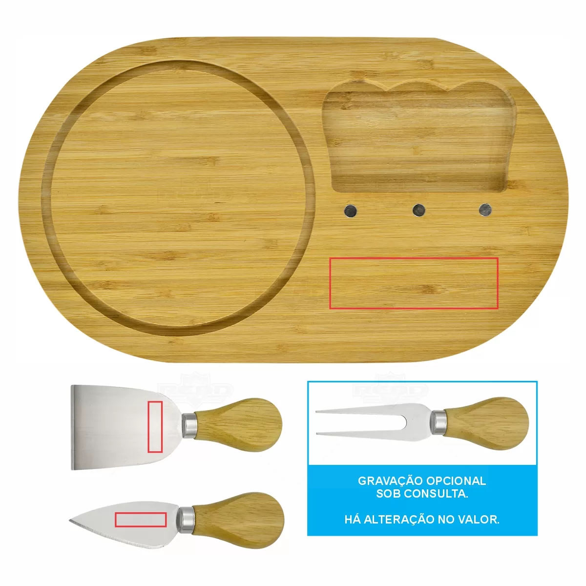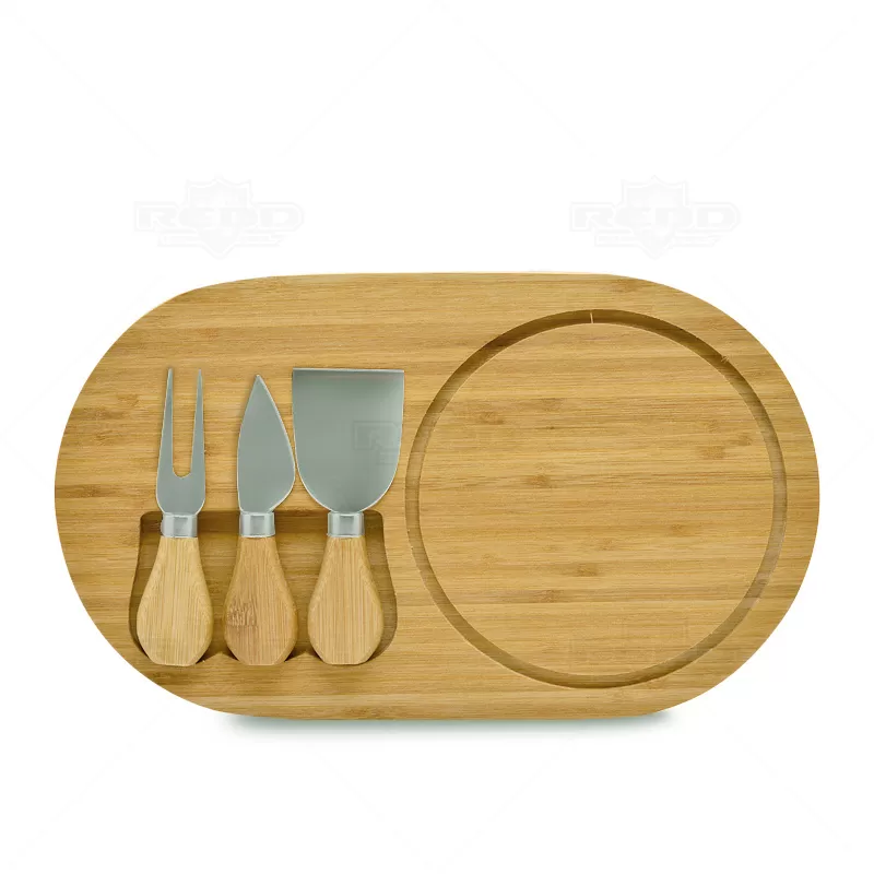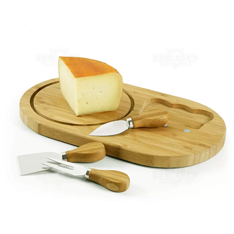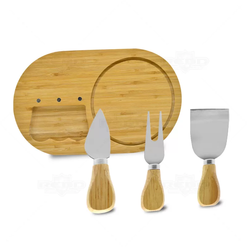 Kit queijo personalizado com 3 talheres em inox e 1 tábua em bambu. Contém 1 garfo para servir, 1 faca para queijos duros, 1 espátulas e 1 tábua que permite encaixar os talheres após o uso. Acompanha embalagem. Objetos decorativos não acompanham o produto. Ideal para divulgar sua empresa em eventos corporativos, brindes personalizados e campanhas promocionais.