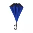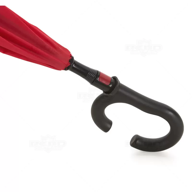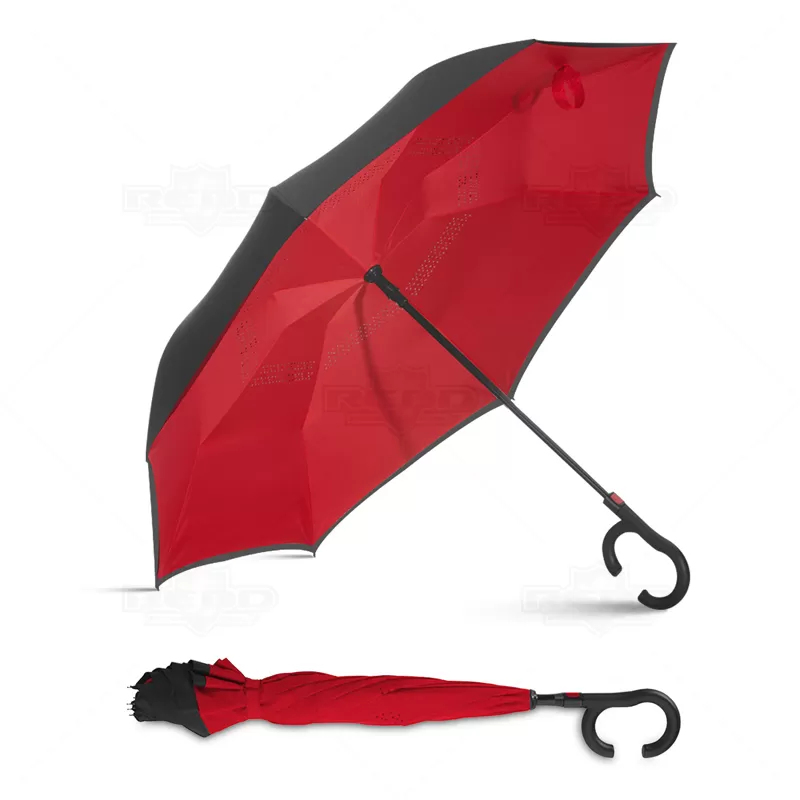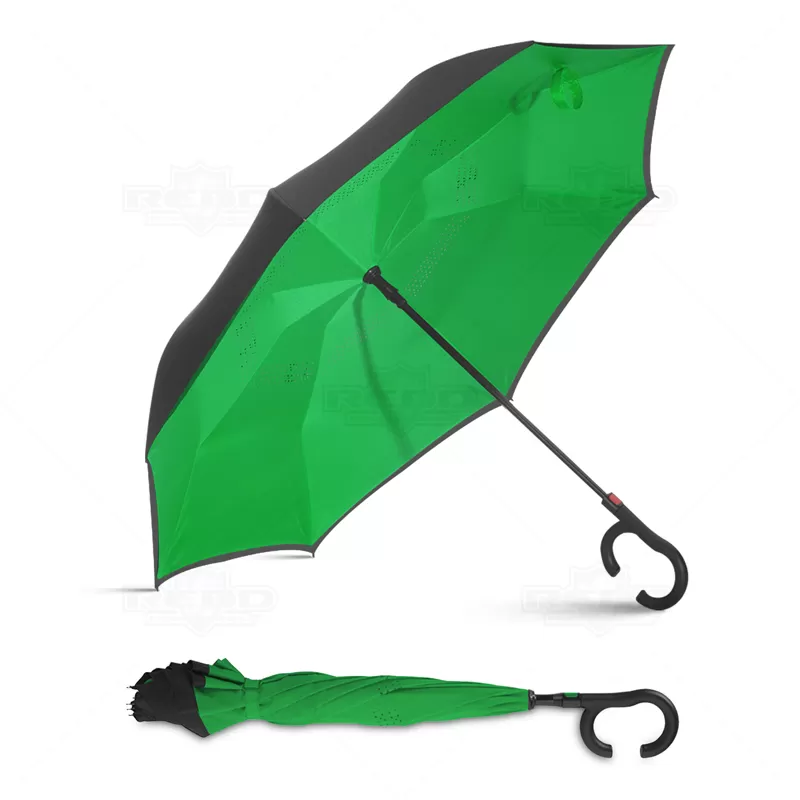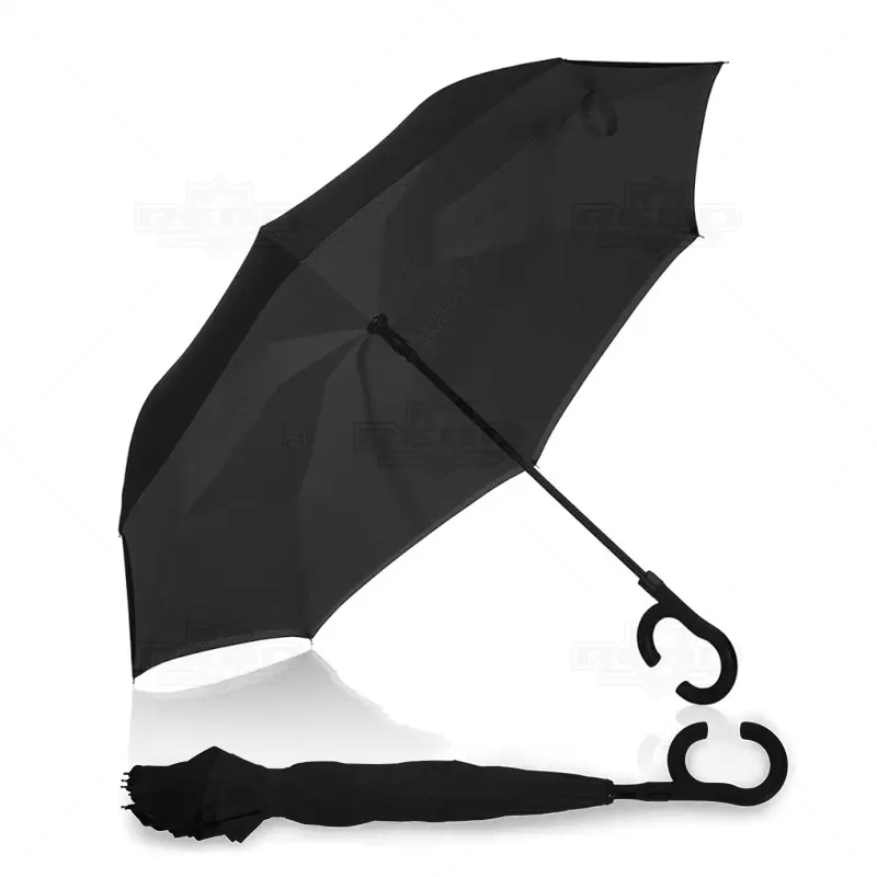 Guarda-chuva invertido personalizado com forro interno, produzido em ponge chinês e seda crua poliéster. Possui 8 varetas, cabo de plástico em formato C, acionamento automático, botão acionador vermelho e fita com velcro para fechamento. Com um mecanismo inovador que permite não se molhar ao entrar e sair de ambientes devido sua abertura invertida impedindo a chuva. Ideal para brindes personalizados, promoções realizadas principalmente no segmento de beleza, saúde e eventos corporativos. Abertura total: ø1120 mm