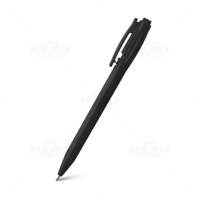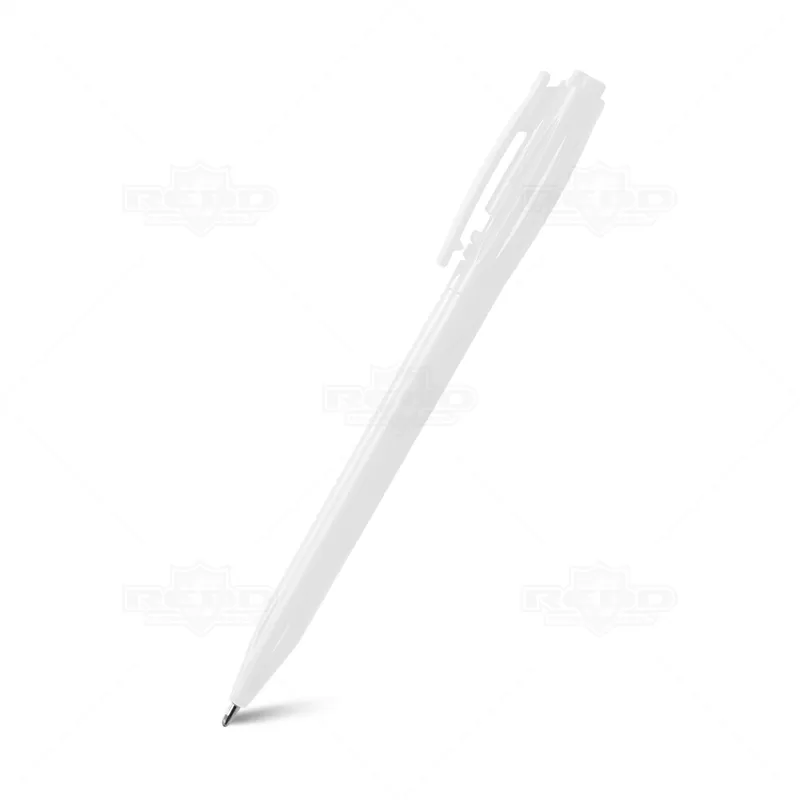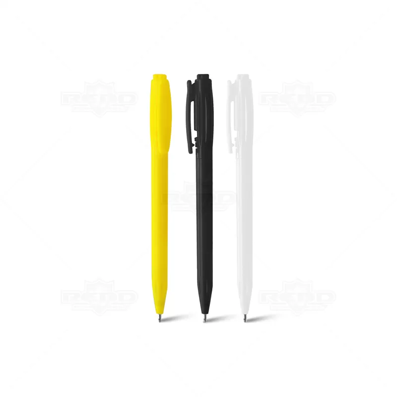 Caneta plástica personalizada com detalhe em relevo na parte superior ao redor do clip. Possui escrita na cor azul, acionamento por clique e para destravar basta apertar a parte inferior do clip. Ideal para divulgar sua empresa em eventos corporativos, brindes personalizados e campanhas promocionais.