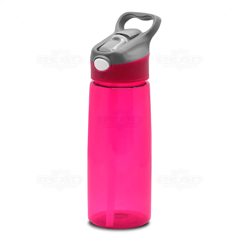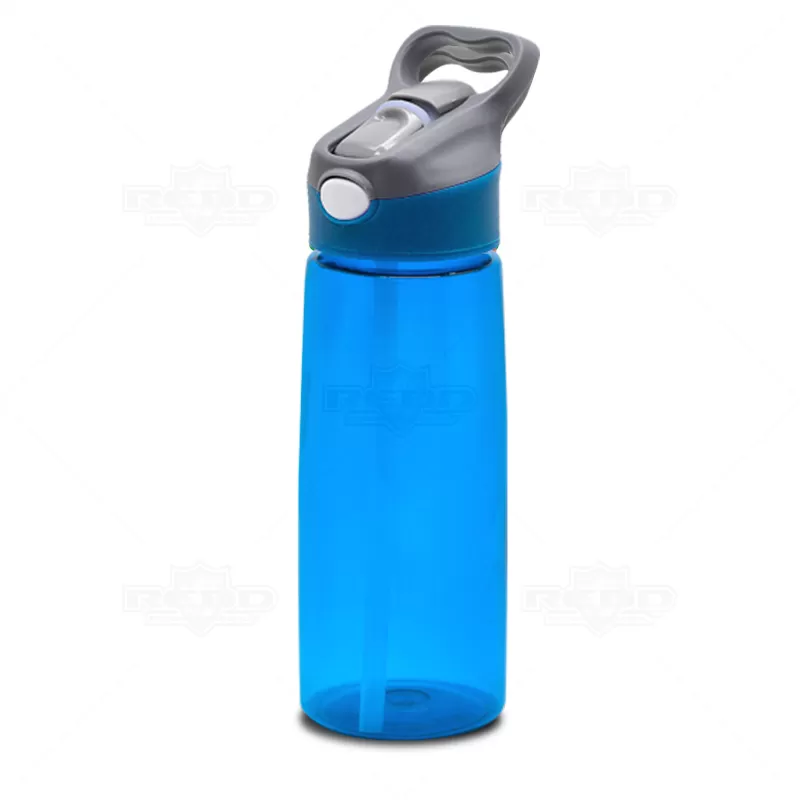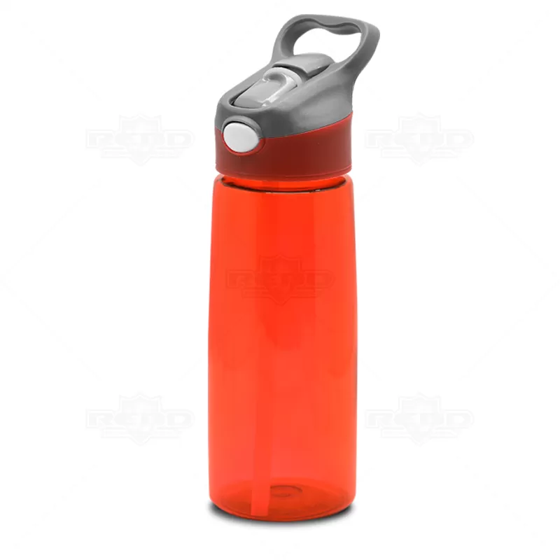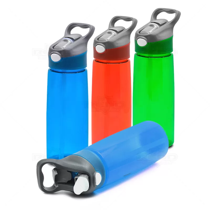 Squeeze plástico personalizado com acionador automático. Possui alça de mão, tampa protetora rosqueável, botão acionador automático do bico, bico em silicone atóxico e corpo plástico com capacidade de 650ml. Ideal para divulgar sua empresa em eventos corporativos, brindes personalizados e campanhas promocionais.