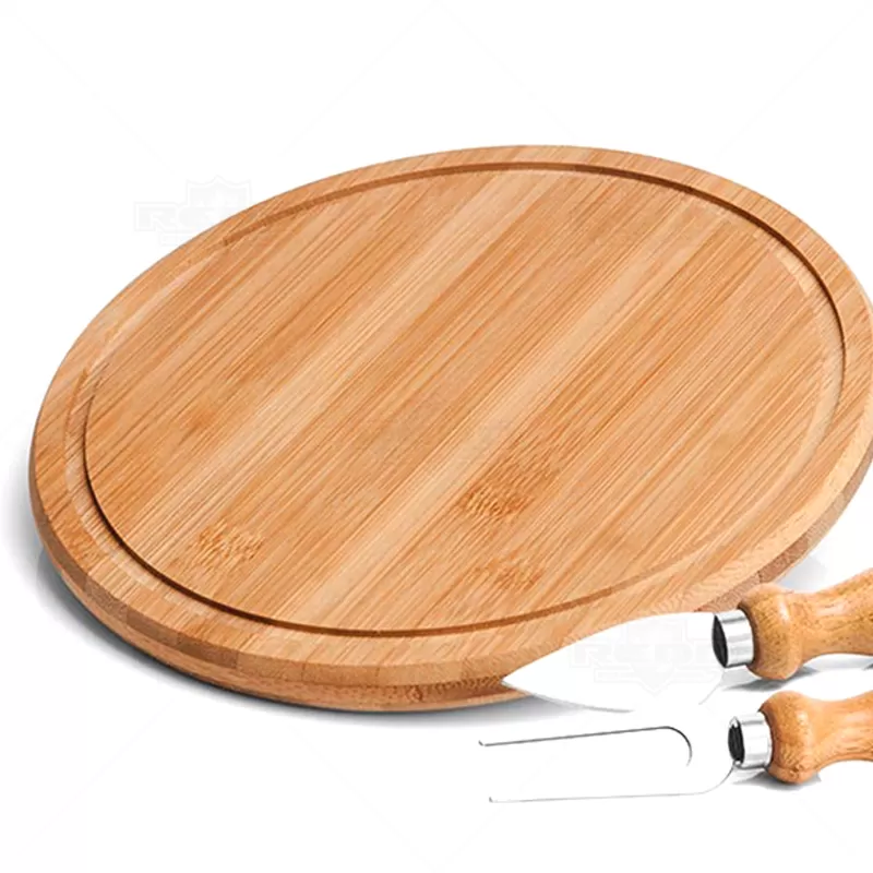 Kit queijo personalizado com tábua tripla em camadas de bambu, possui 1 faca com ponta em inox e 1 garfo para queijo ambos com cabo de madeira. Produto ecológico e ideal para empresas ou ações que buscam transmitir mensagens relacionadas à sustentabilidade.