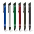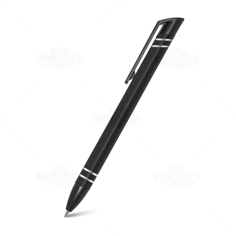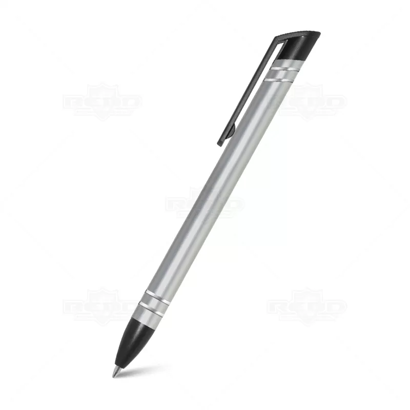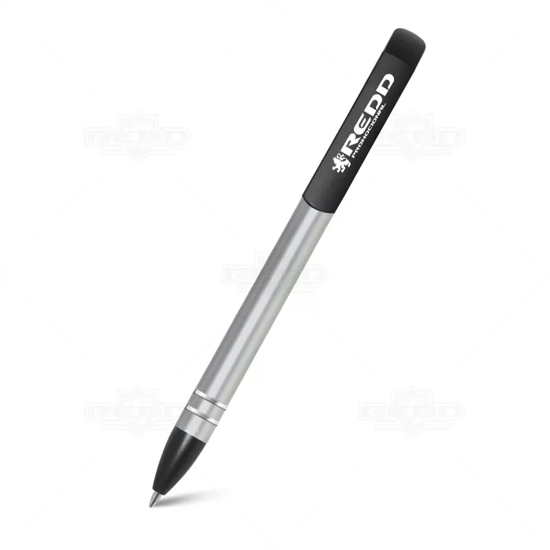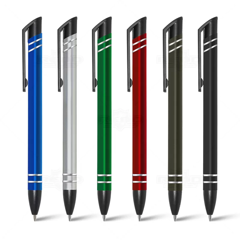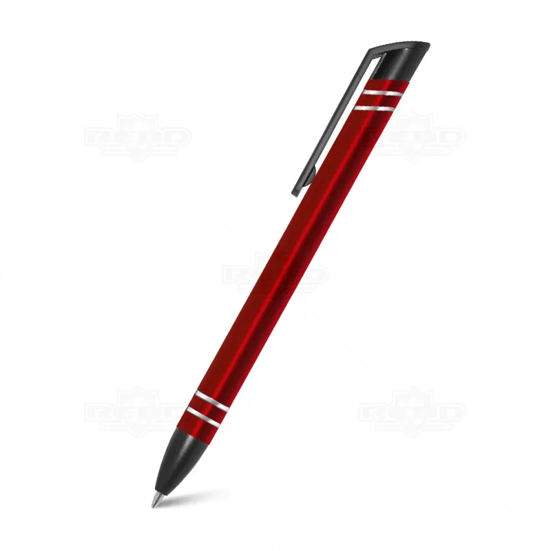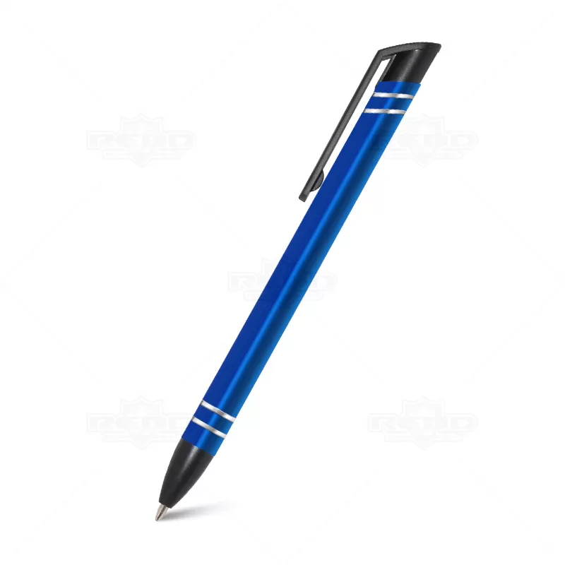 Caneta de metal personalizada, com design inovador, possui detalhes em anéis prateados, clip em plástico ABS, corpo com acabamento brilhante e esferográfica azul com acionamento por click. Ideal para divulgar sua marca em brindes promocionais e eventos corporativos.