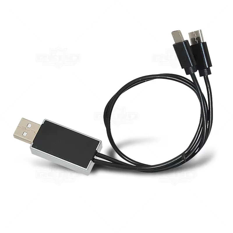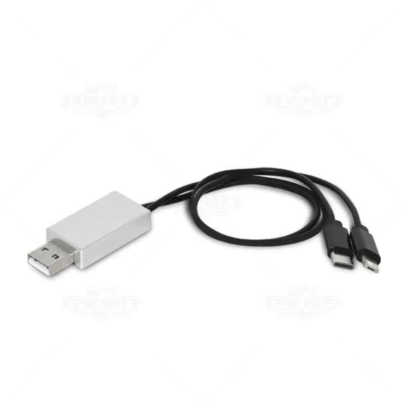 Cabo USB personalizado para carregamento com 2 saídas sendo elas 1 saída V8 type-C (android) e 1 saída micro USB. Ideal para brindes personalizado e eventos corporativos. cabo não transfere dados somente é indicado para carregamento. A gravação no processo em laser na peça corrói uma camada fina do produto deixando a área visível de maneira que quando conectado à porta USB o logotipo ficará visível com a iluminação interna do produto.