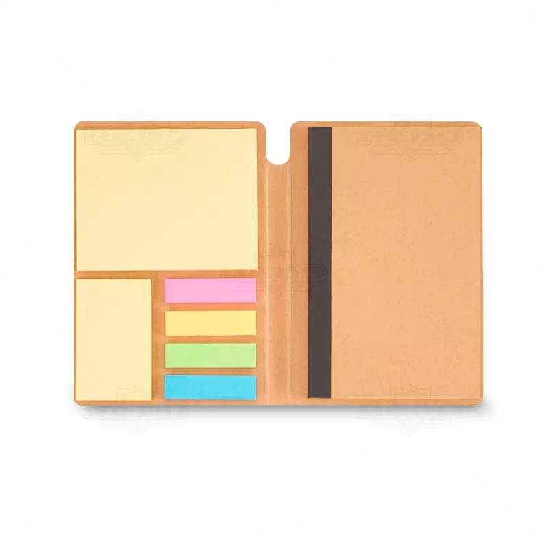 Bloco de anotações personalizado produzido em papel Kraft com capa dura e acabamento em textura aveludada, possui fecho de elástico, miolo sem pauta com aproximadamente 50 folhas na cor bege, 4 blocos autocolantes coloridos e 2 blocos amarelos médio e grande todos contendo aproximadamente 30 folhas. Ótima opção para divulgar sua empresa utilizando o logotipo gravado no produto para distribuição em eventos promocionais, brindes corporativos e campanhas de marketing.