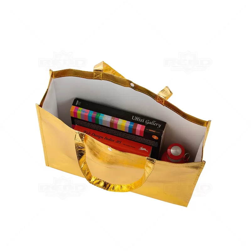 Sacola laminada personalizada produzida em TNT com revestimento interno plástico e acabamento externo metálico, possui botão plástico para fecho e alça de 22cm na parte superior. Com um design moderno e elegante. Ideal para divulgar sua empresa em eventos corporativos, brindes personalizados e campanhas promocionais. Obs: os objetos no interior da sacola são ilustrativos e não estão inclusos no produto.