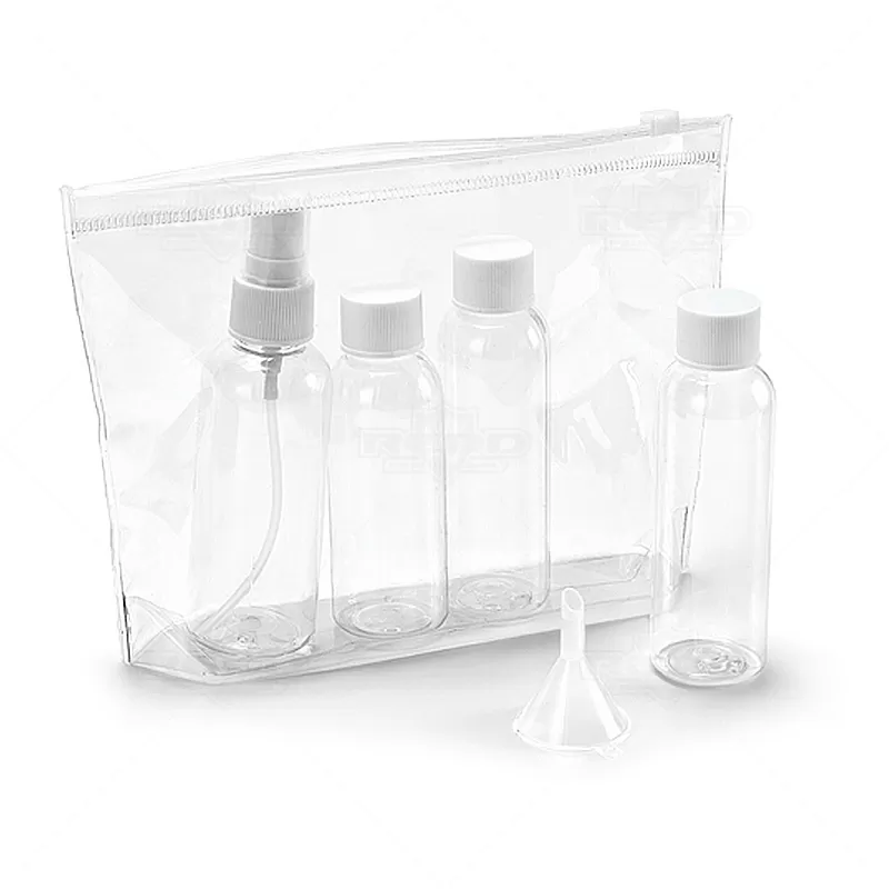 Kit viagem 5 peças personalizado possui 2 frascos de 65 ml, 1 frasco de 60 ml, 1 vaporizador de 80 ml e 1 funil. Ótimo para viagens de avião, compacto perfeito para armazenar cosméticos e líquidos higiênicos e essências. Ideal para brindes em campanhas promocionais feiras e eventos corporativos.