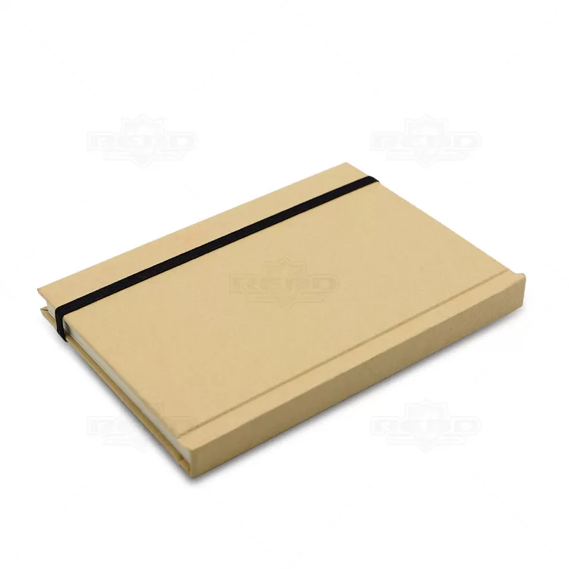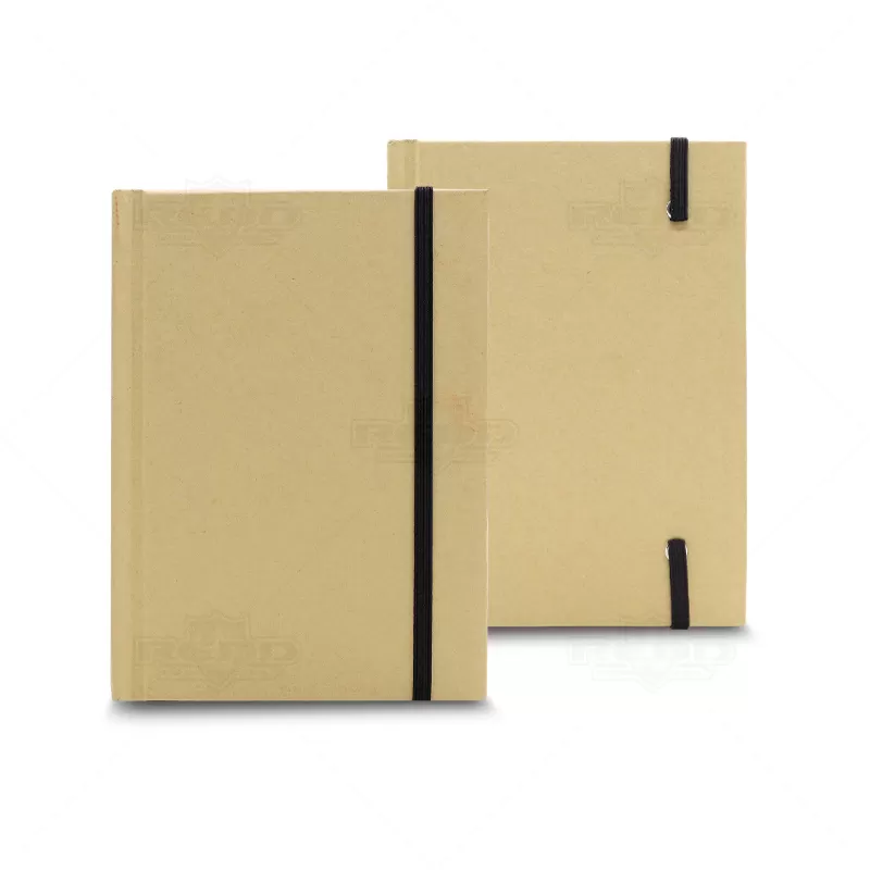 Bloco de anotações personalizado com capa dura em papel Kraft, contem aproximadamente 100 folhas não pautadas na cor bege. Possui fecho de elástico e marca página em nylon. Ideal para brindes promocionais e distribuição em feiras e eventos corporativos.