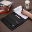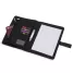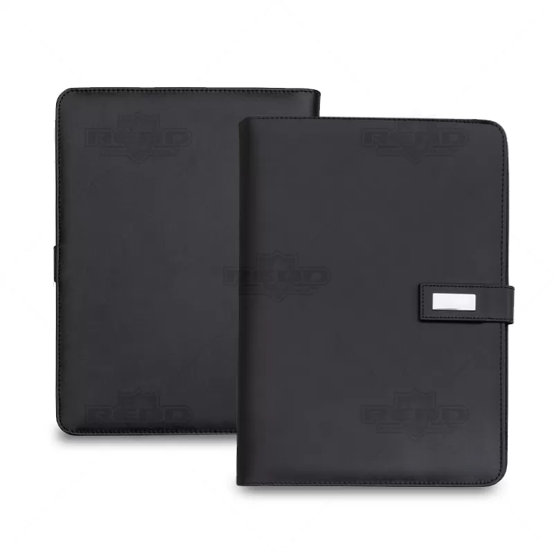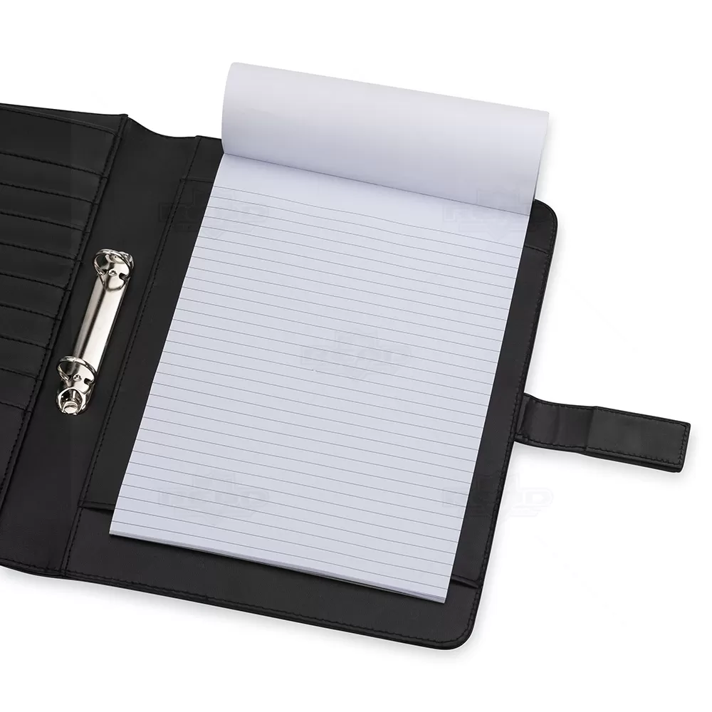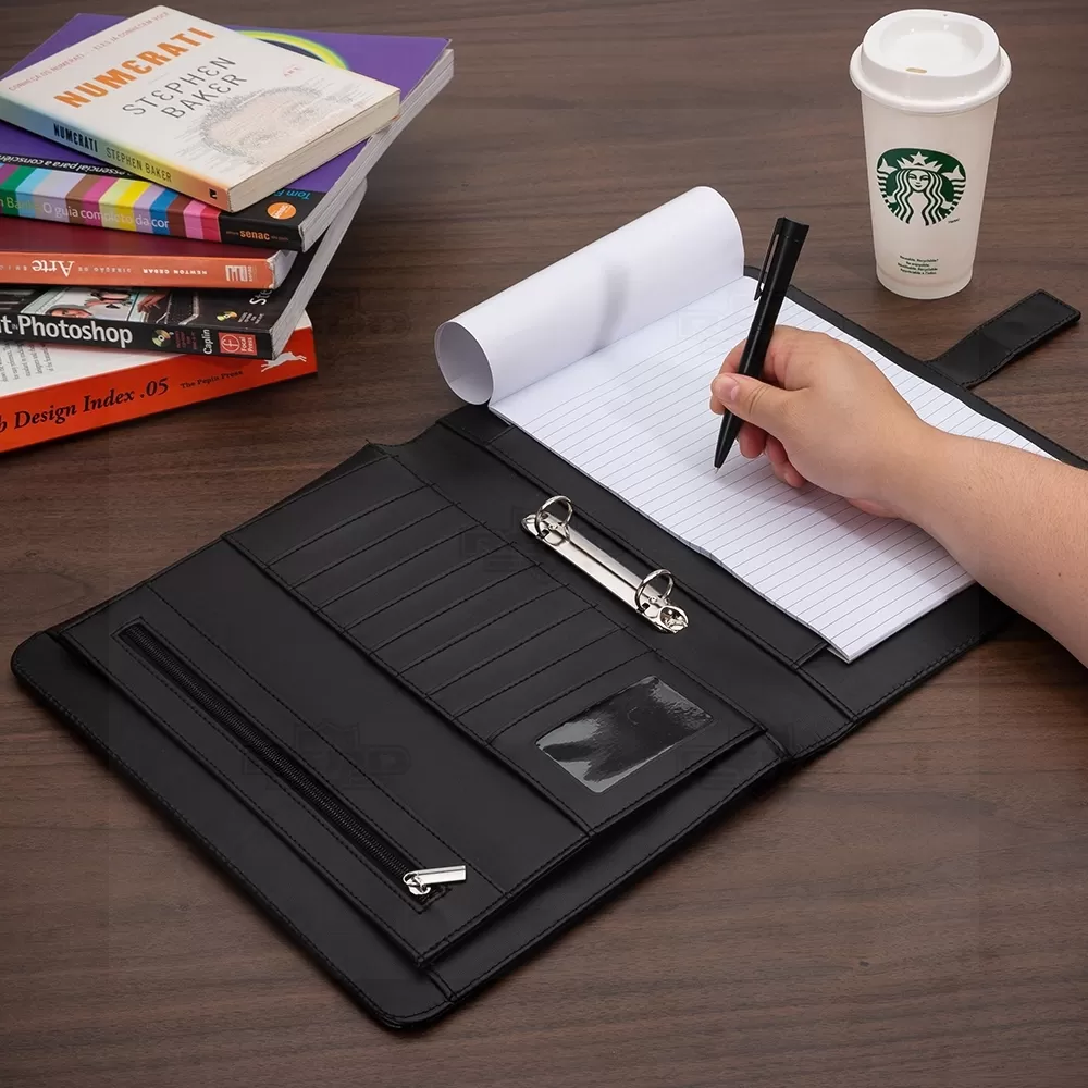 Pasta para convenção personalizada, produzida em couro sintético, possui fecho imantado com placa para gravação, bloco de anotações com aproximadamente 20 folhas pautadas, duas argolas de acesso para fichário, fechamento em zíper, bolso lateral na contracapa e divisórias para cartões e documentos. Design moderno e elegante é prática e perfeita para transportar arquivos importantes. Ideal para brindes, distribuição em campanhas promocionais e eventos corporativos. Objetos decorativos não estão inclusos no produto.