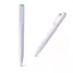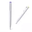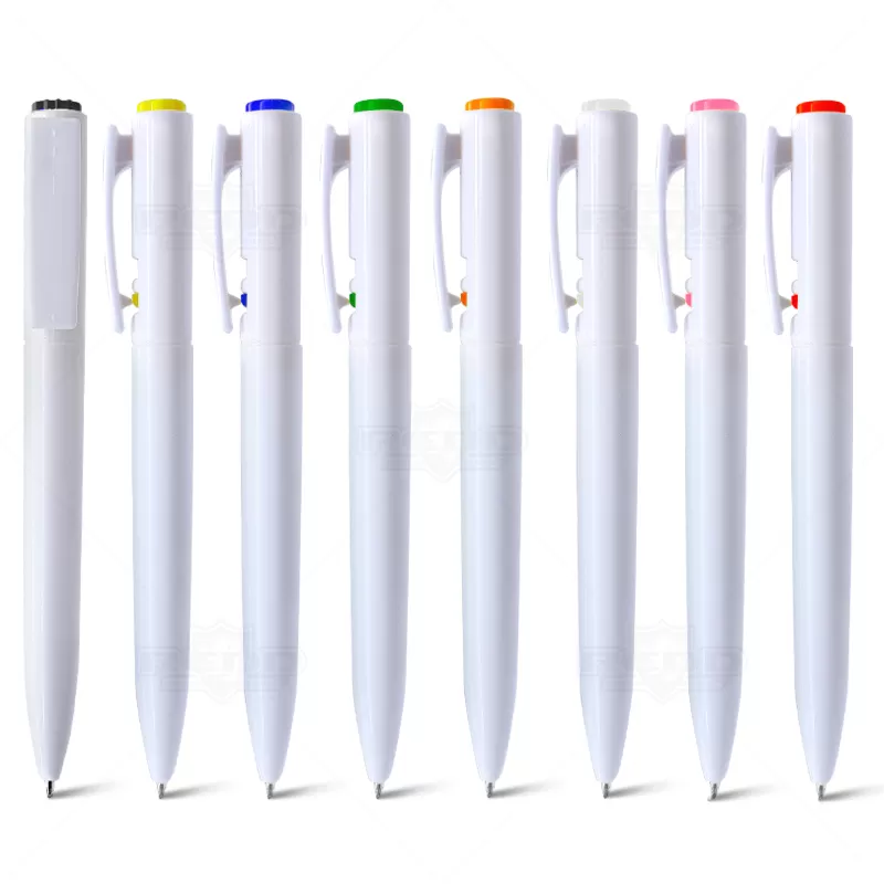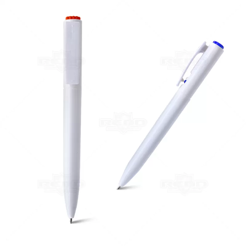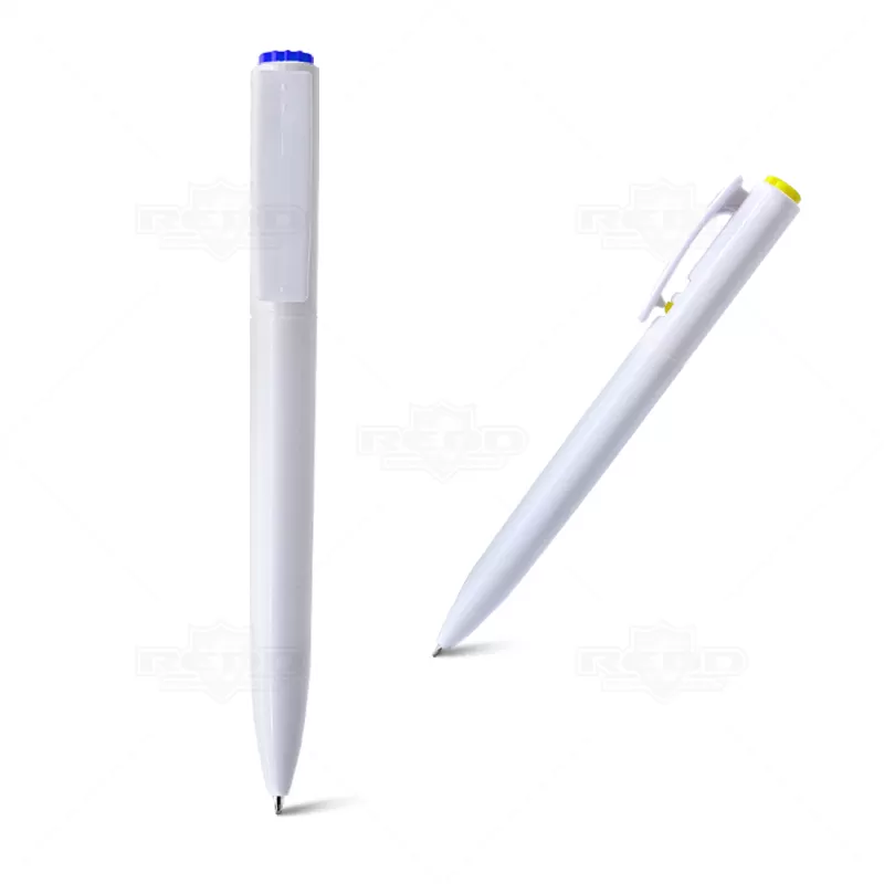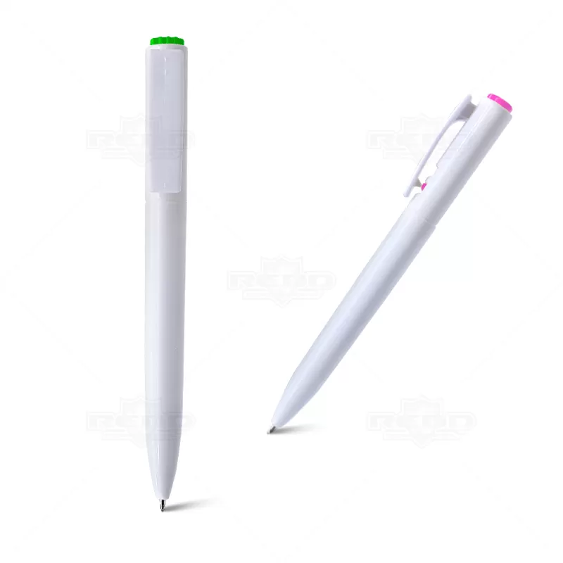 Caneta personalizada produzida em branco com detalhes coloridos. Possui botão de acionamento na ponteira superior e bloqueia através do clip lateral. e esferográfica com a escrita na cor azul . Ideal para brindes promocionais, campanhas e eventos corporativos.